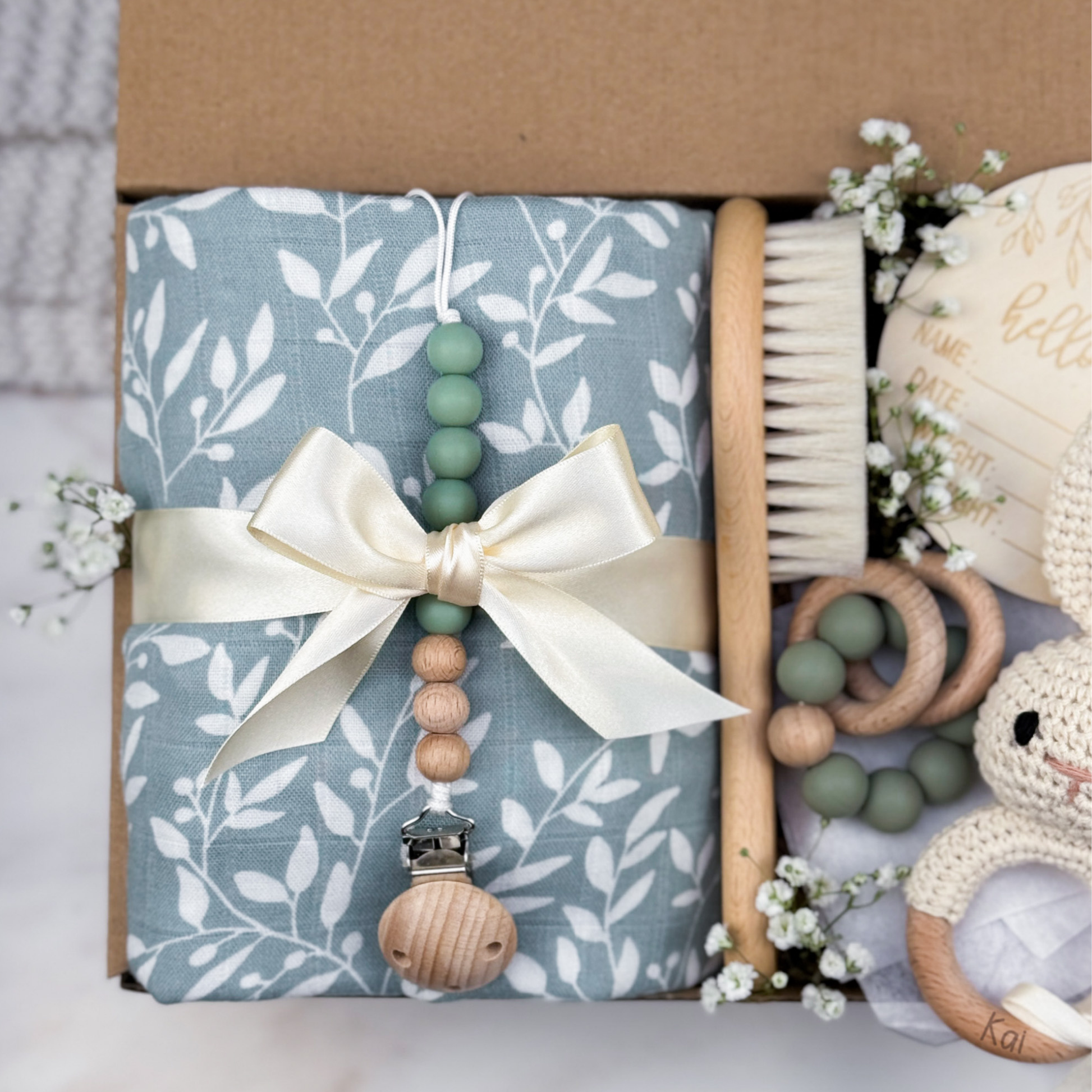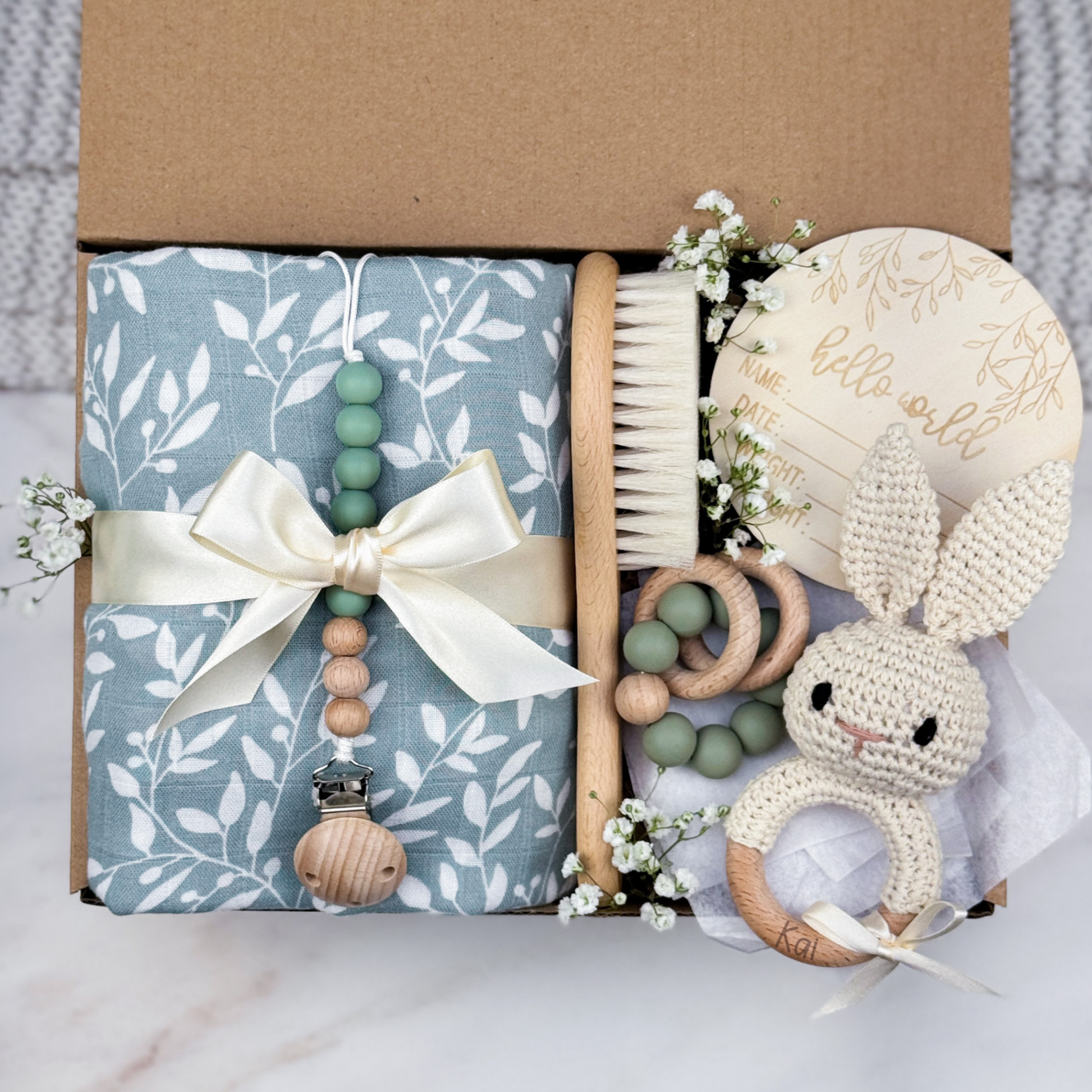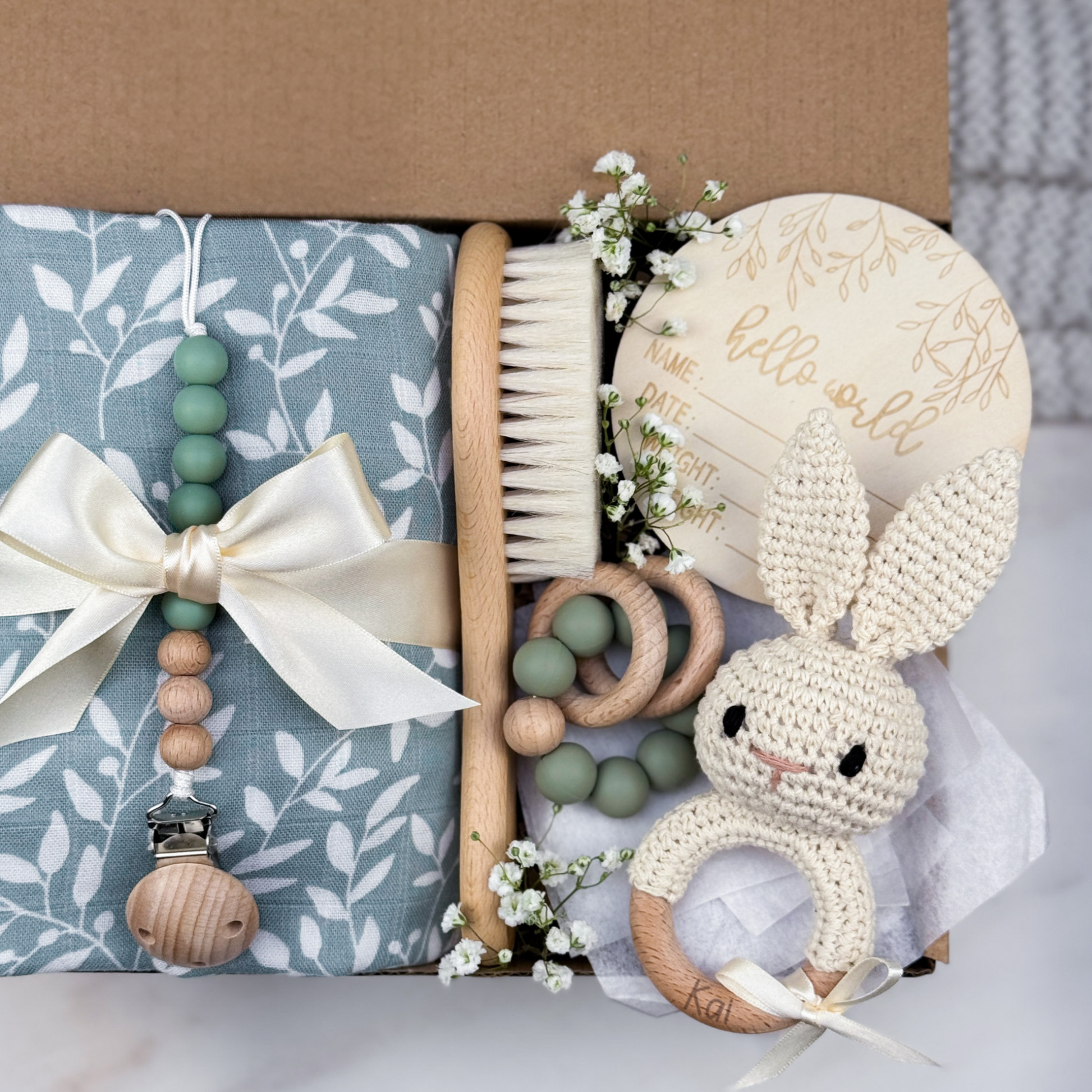 Celebrate baby’s arrival with a soft leaves vibe and crochet bunny rattle. A unique baby boy gift box filled with warmth and fun. Perfect for keepsakes and cuddles.