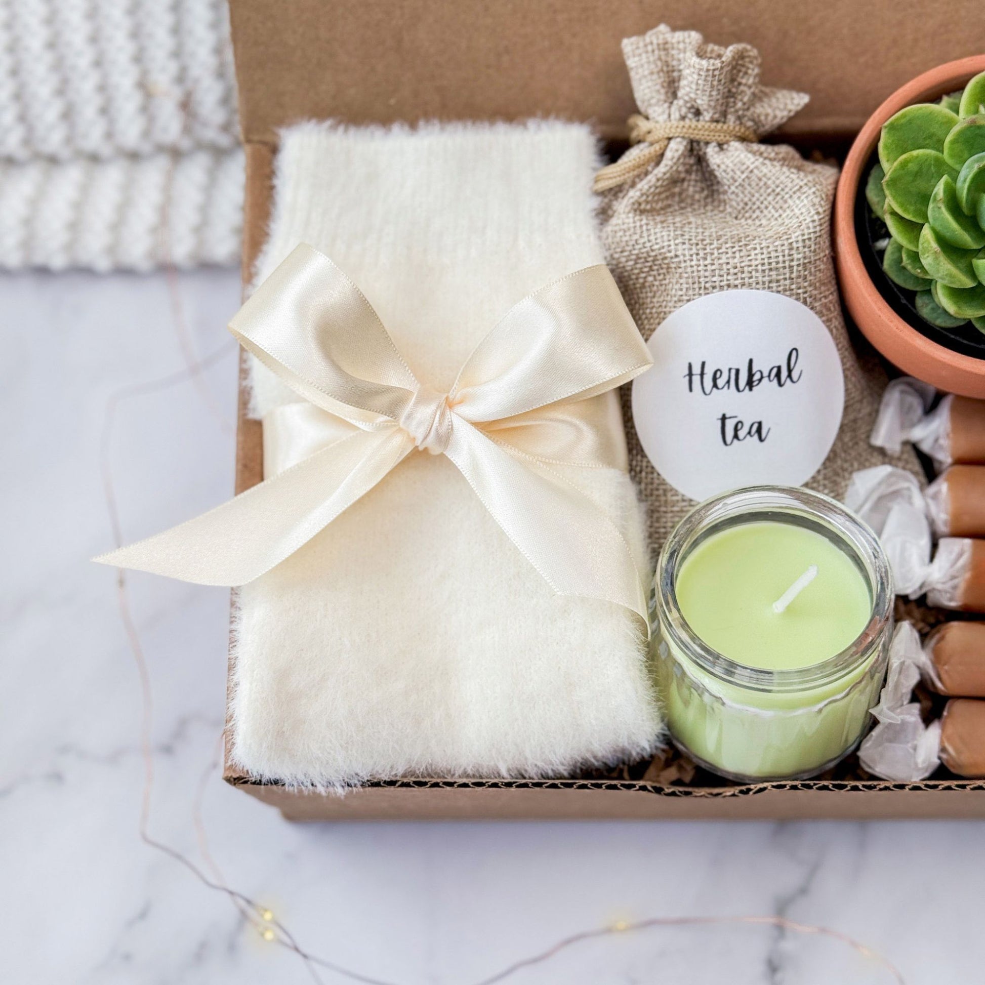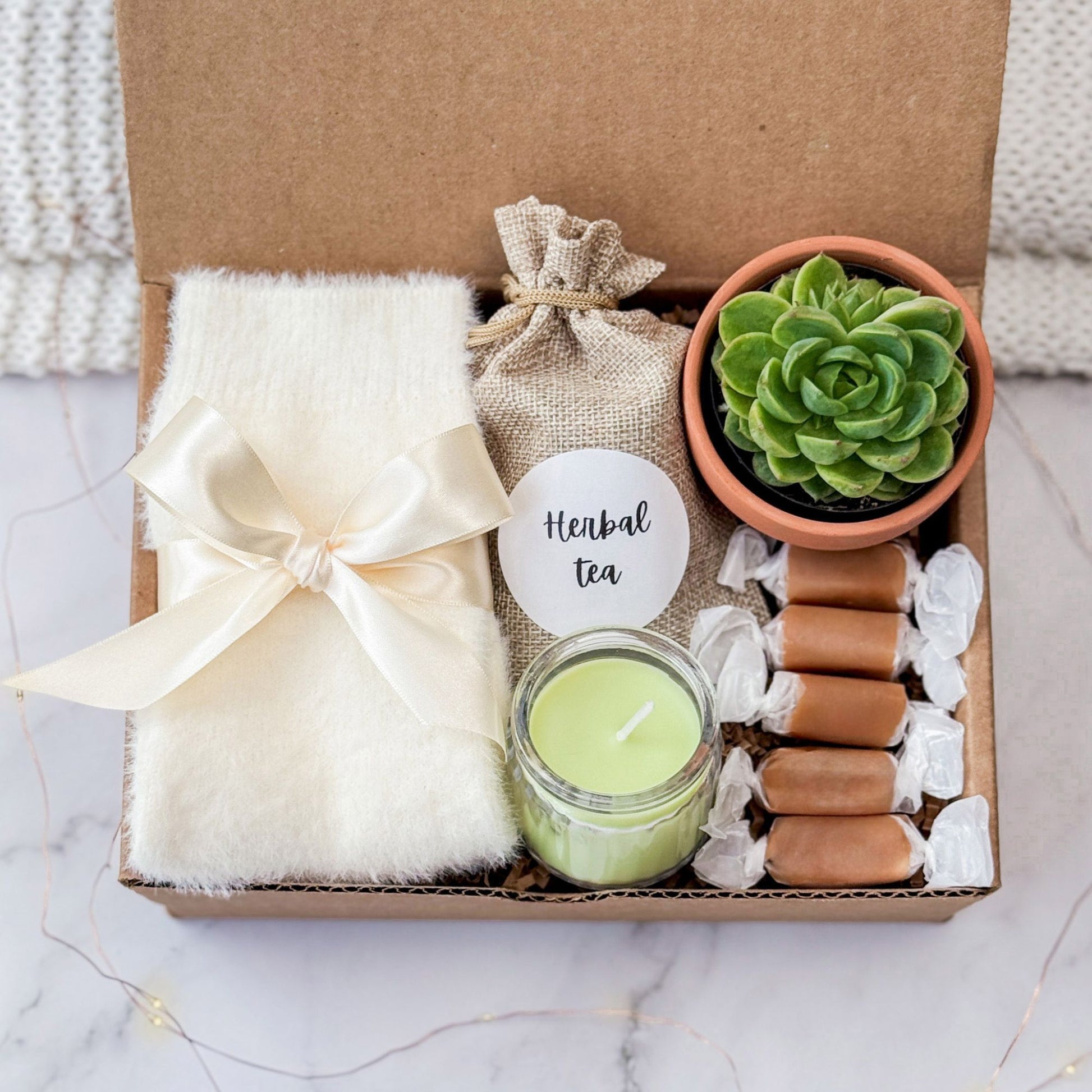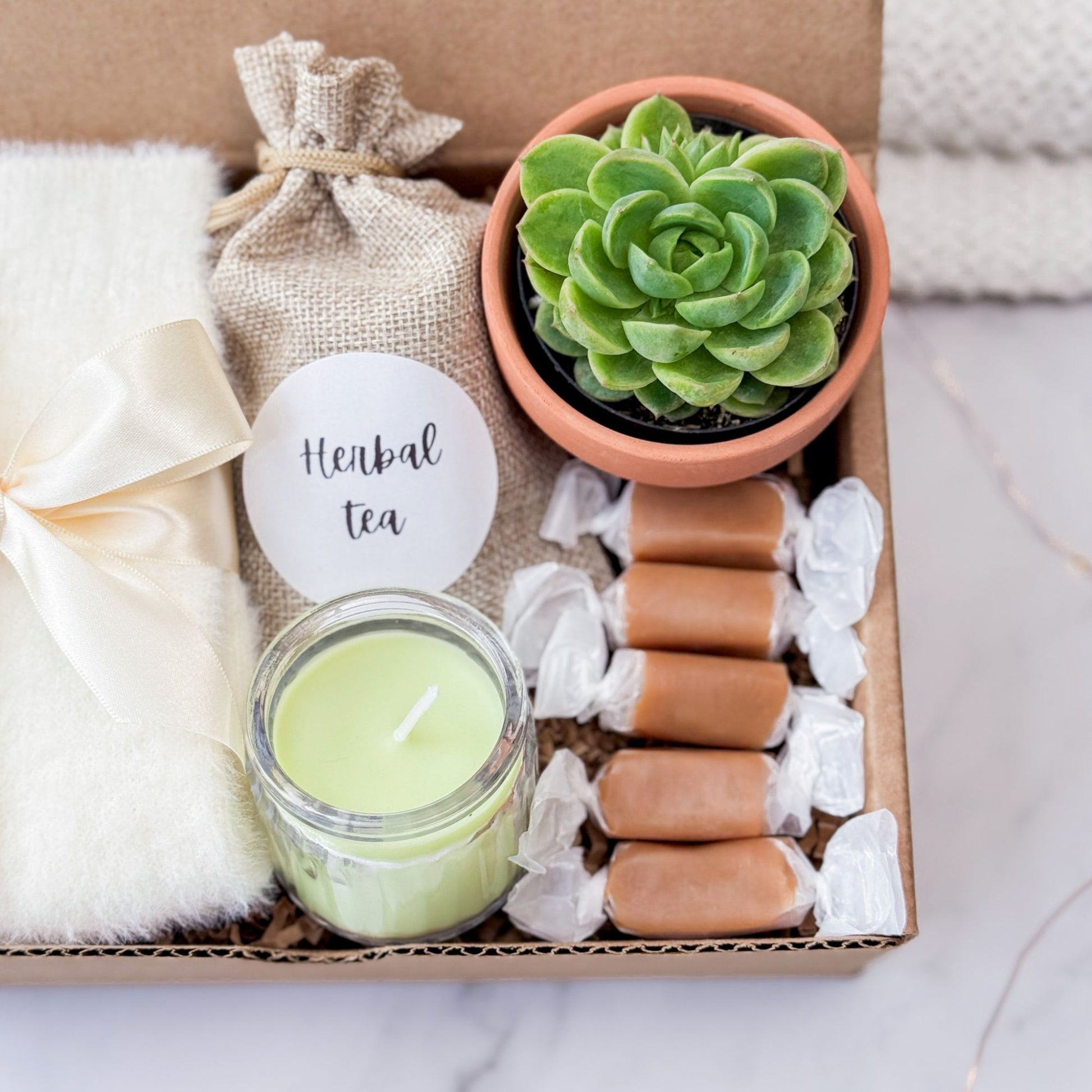 A calming care package inspired by nature. Featuring a live succulent, herbal tea, cozy socks, candle, and caramels—this gift box brings a moment of peace and green beauty. Great for plant lovers and anyone in need of a cozy reset.