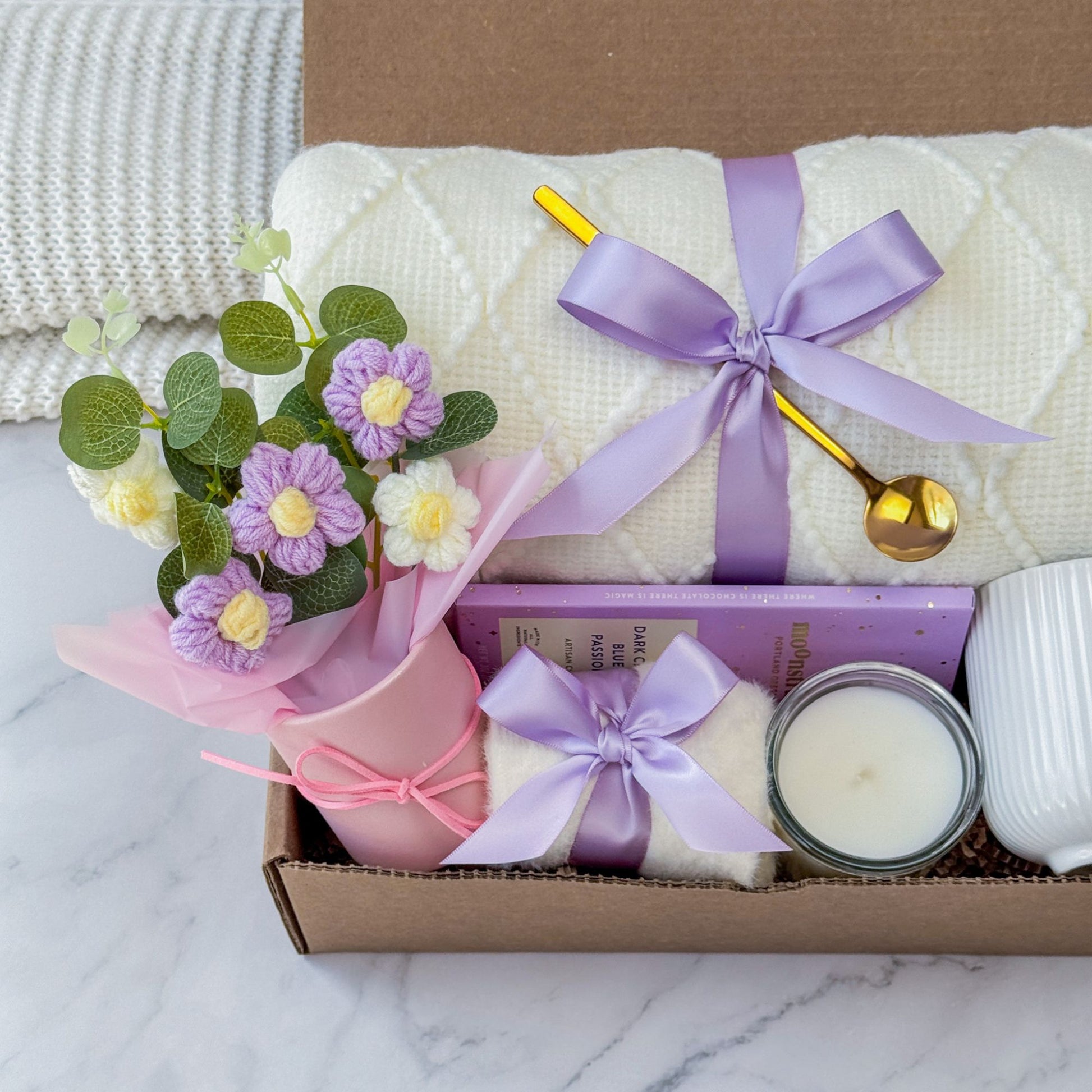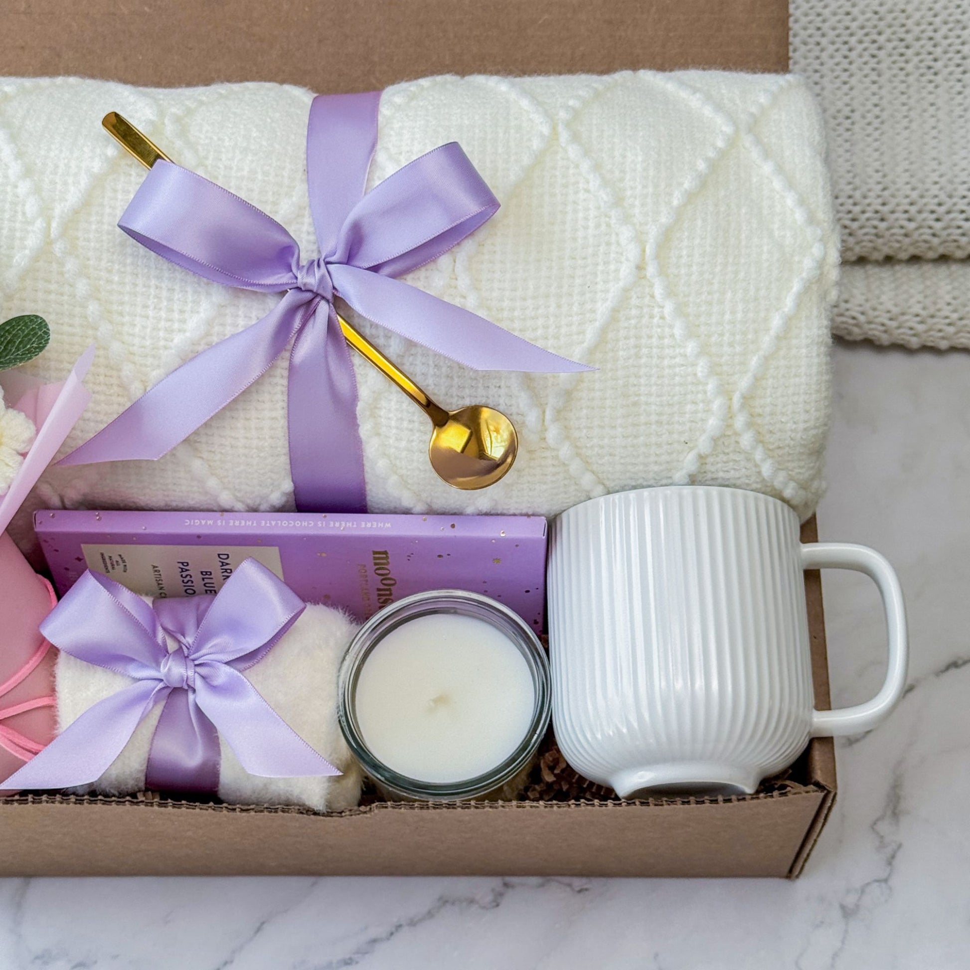 Give the gift of calm with this lavender-inspired spa gift box. It includes a soft throw, candle, chocolate, cozy socks, and a handmade purple flower bouquet—ideal for relaxing evenings and special self-care moments.