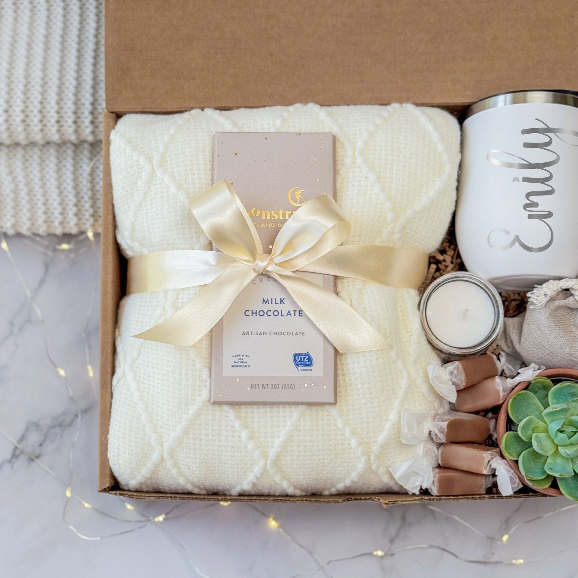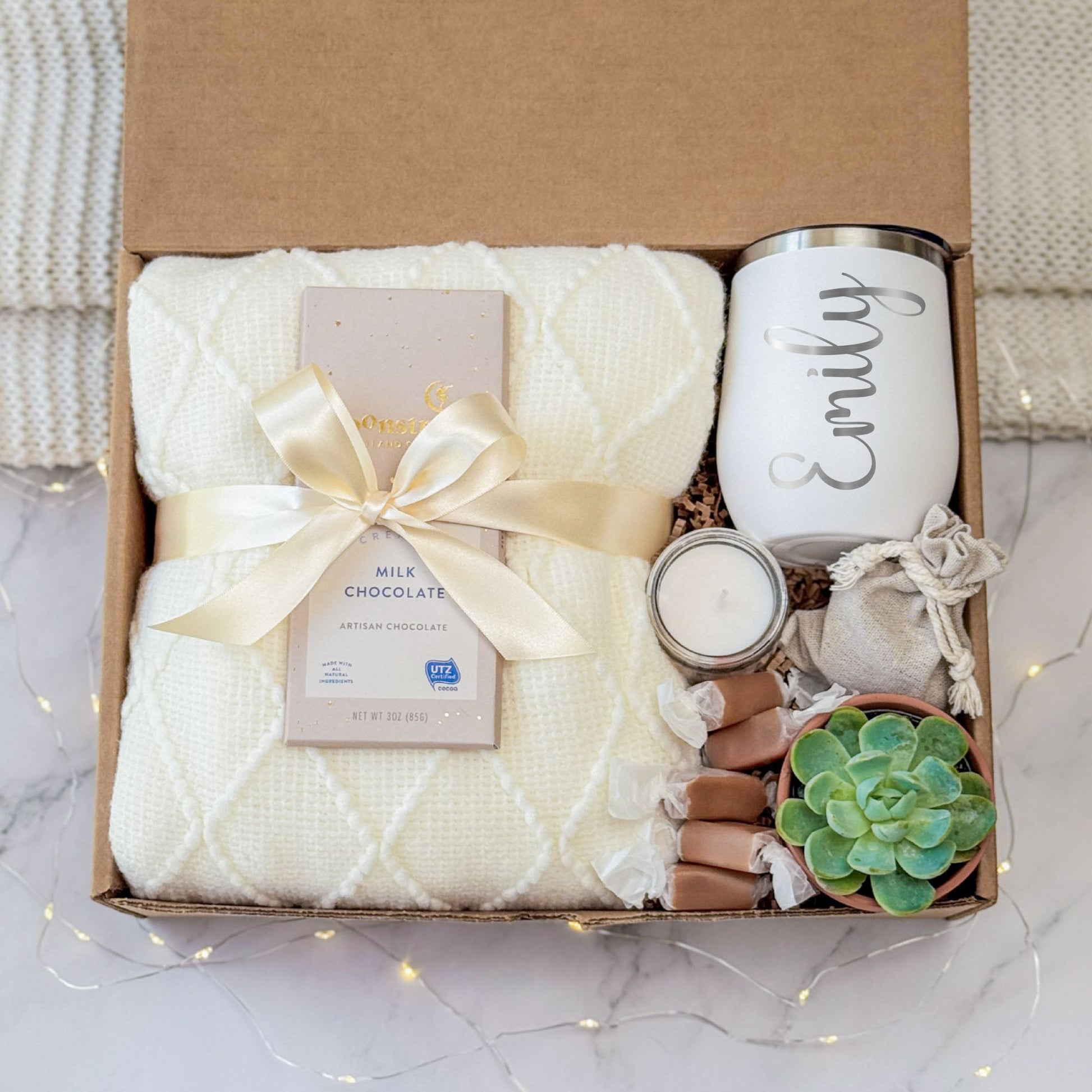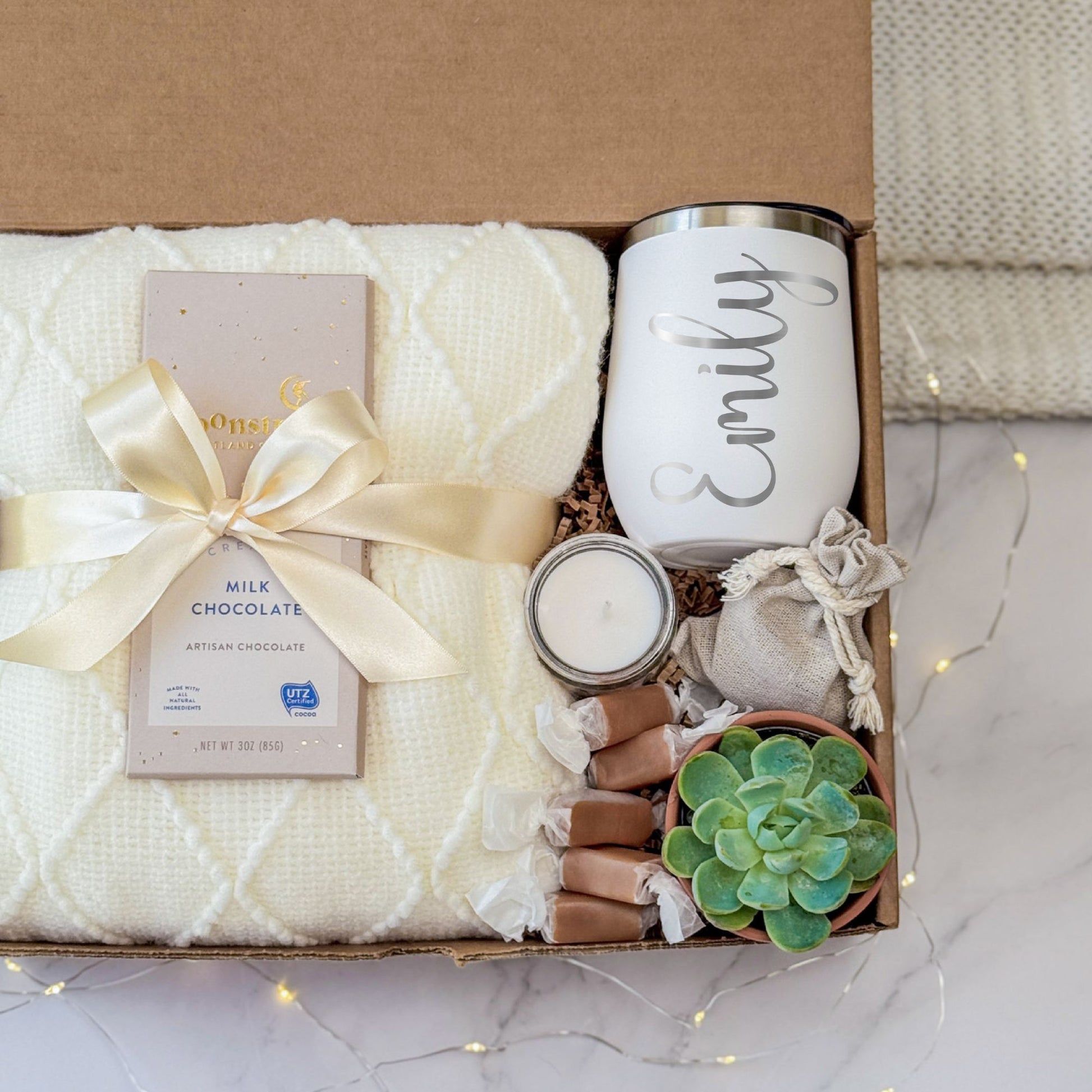 A personalized relaxation gift box designed for cozy moments and thoughtful giving. Ideal for birthdays, appreciation gifts, or wellness care packages. This name gift set includes comfort, nature, and a touch of personalization—perfect for her.