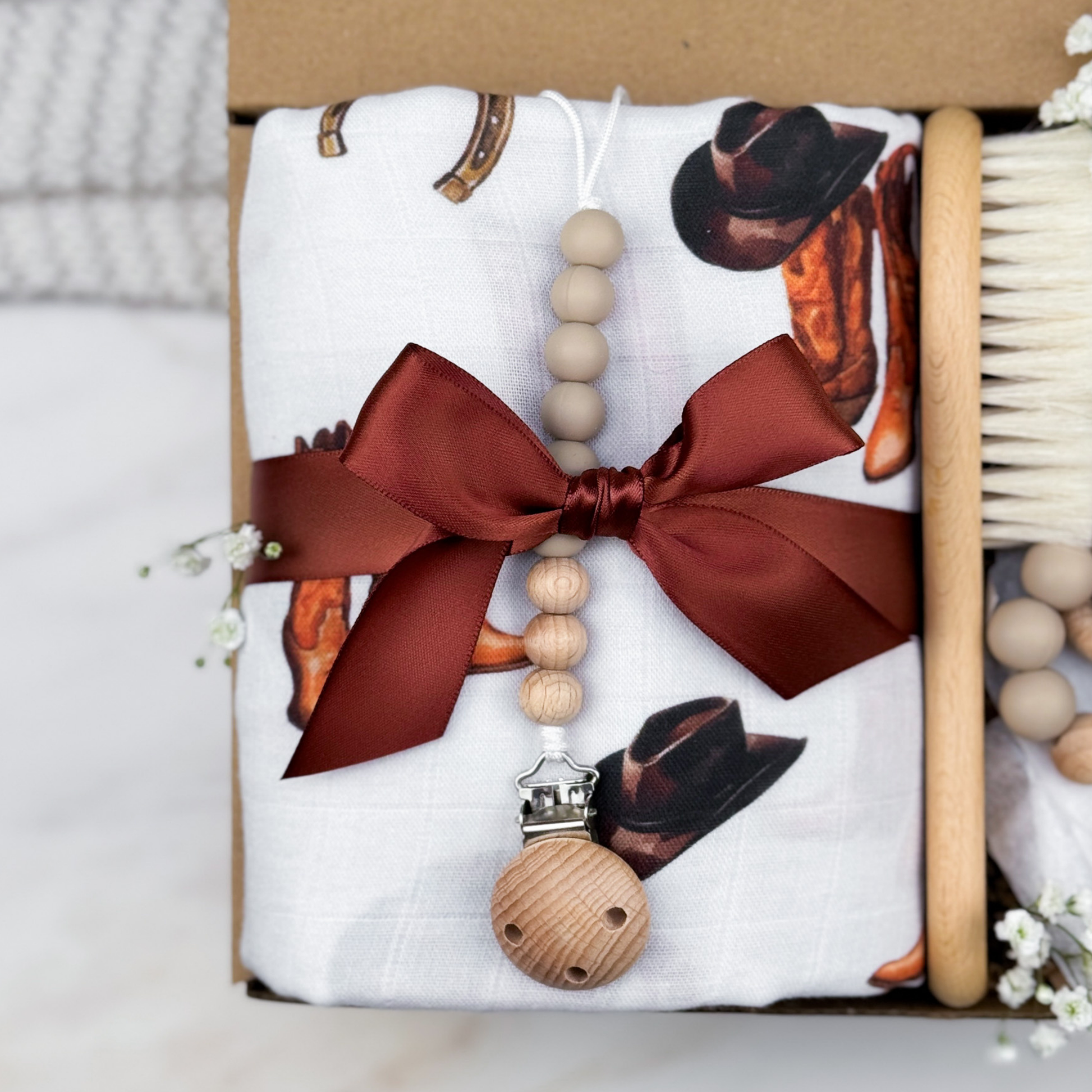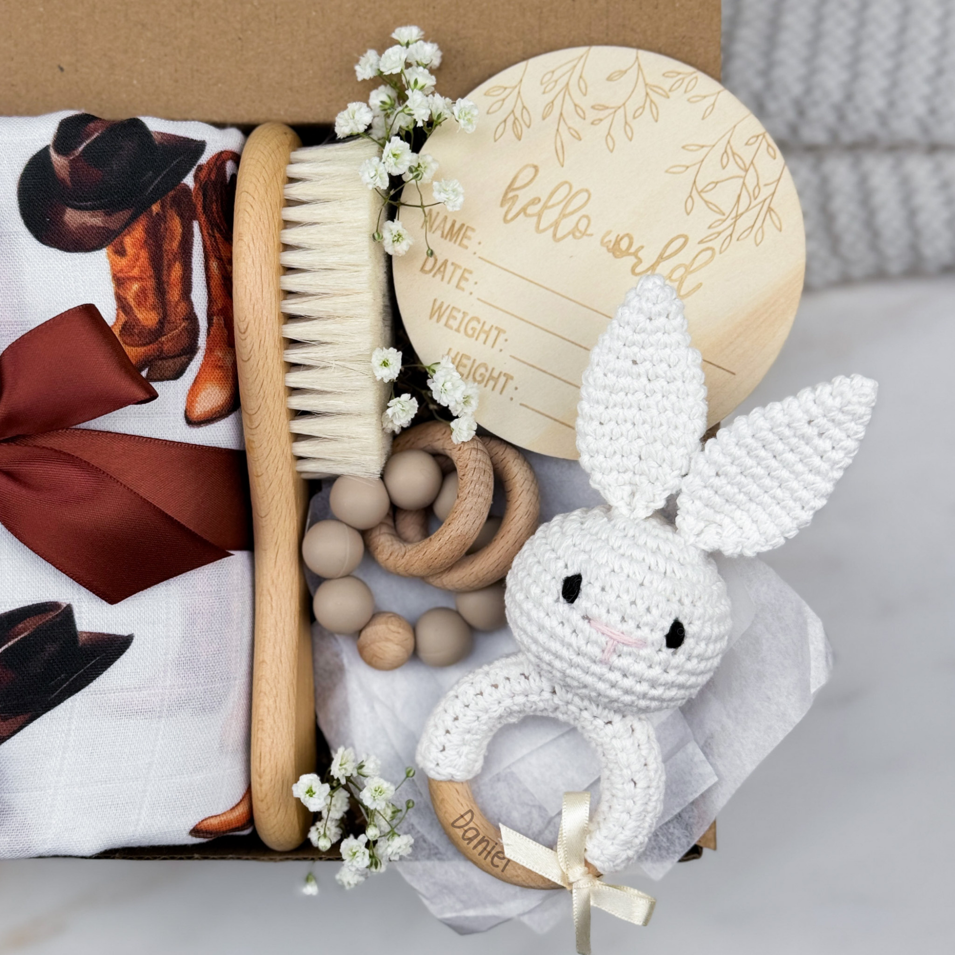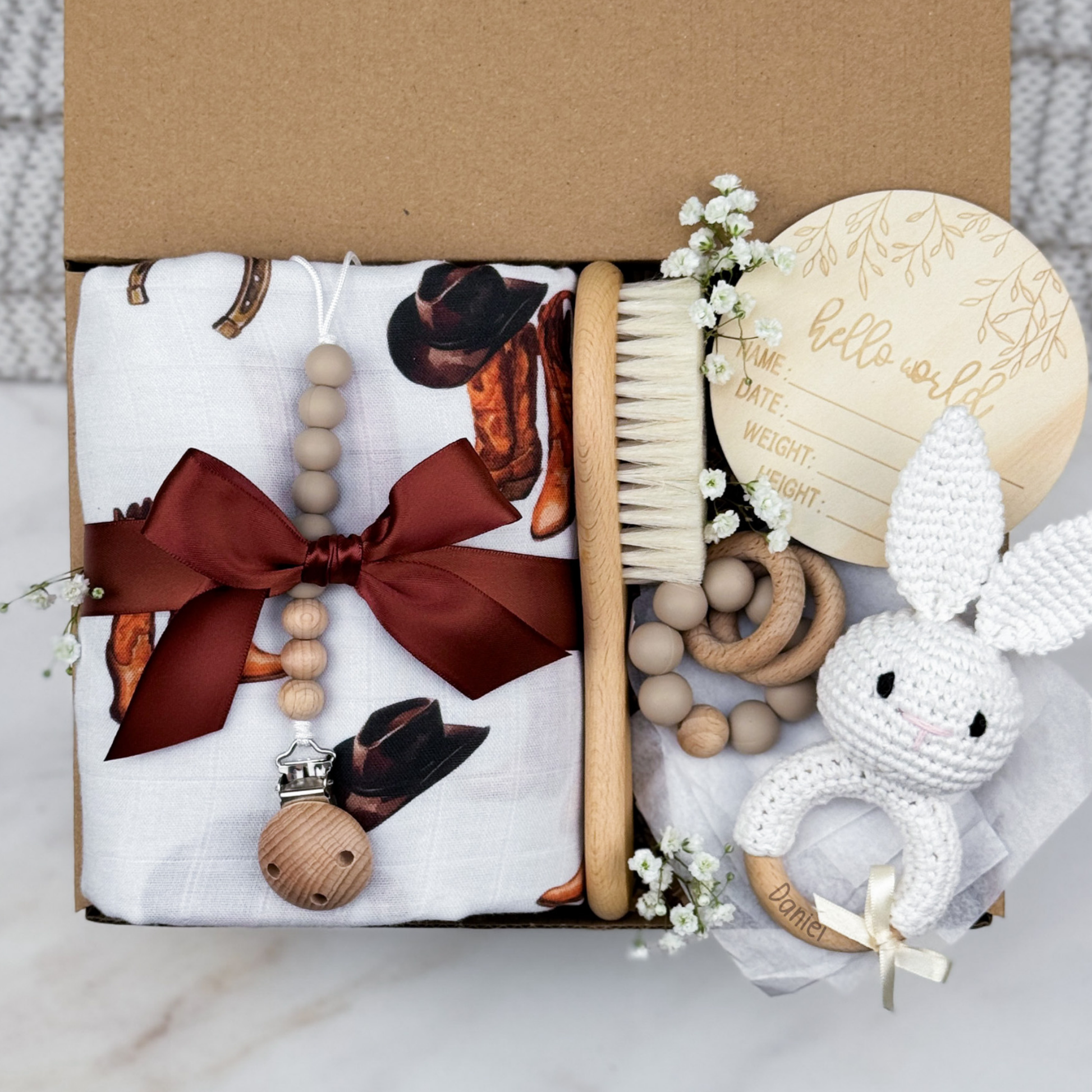 This box brings western style and handmade love together. Featuring soft neutrals and sweet toys, it’s perfect for rustic baby showers. A cozy keepsake box.