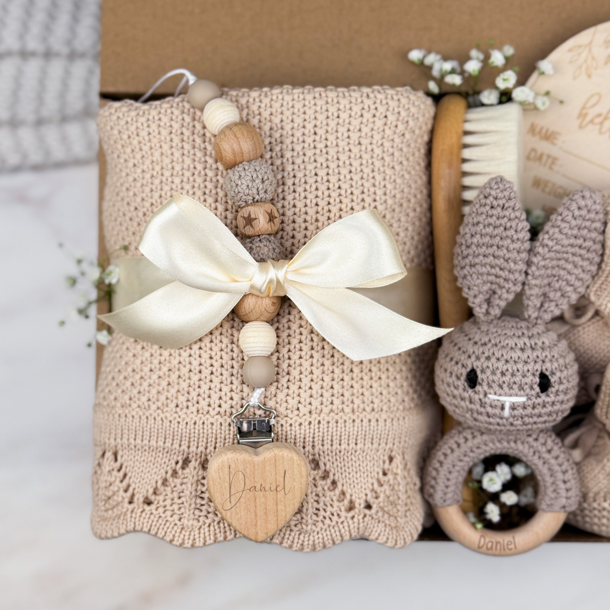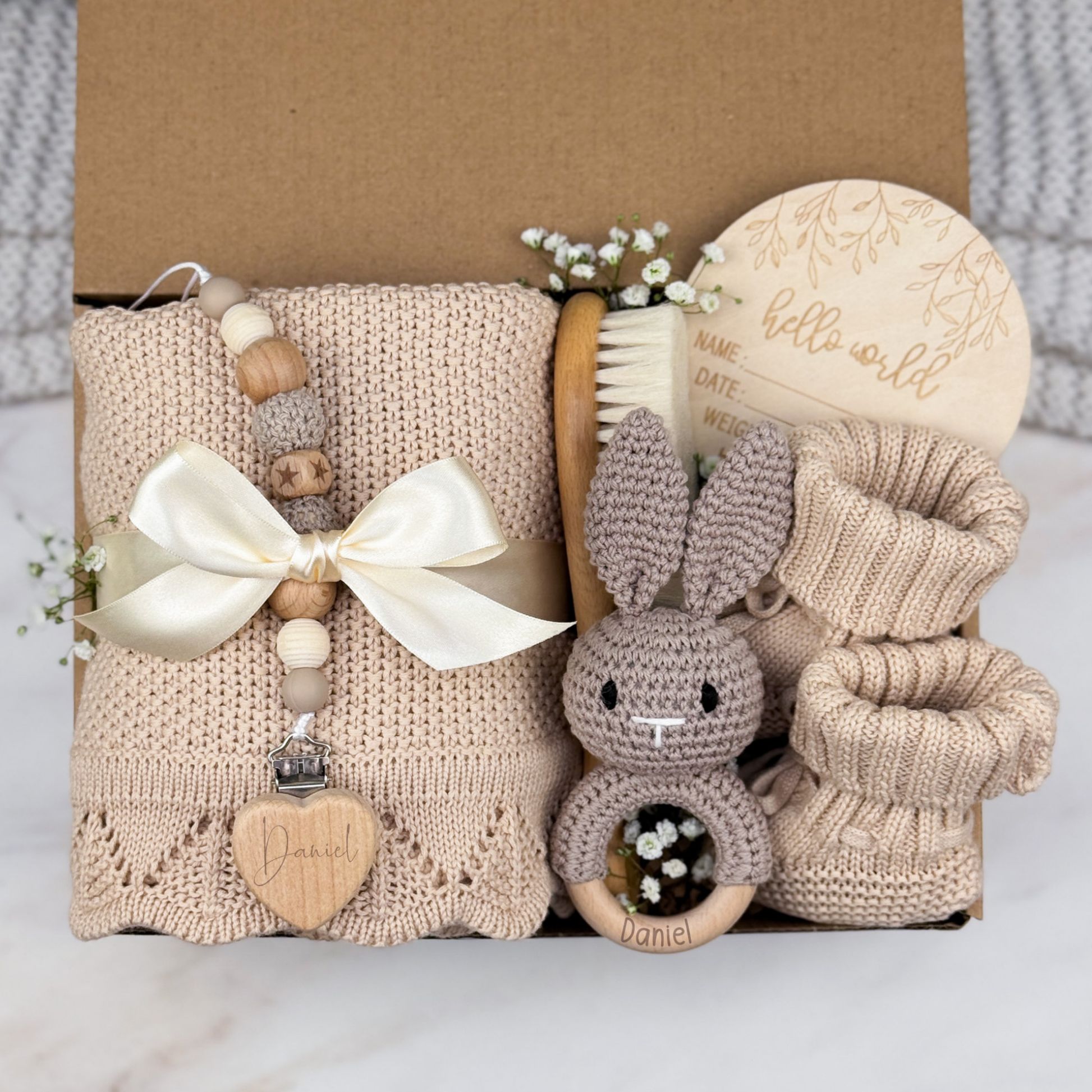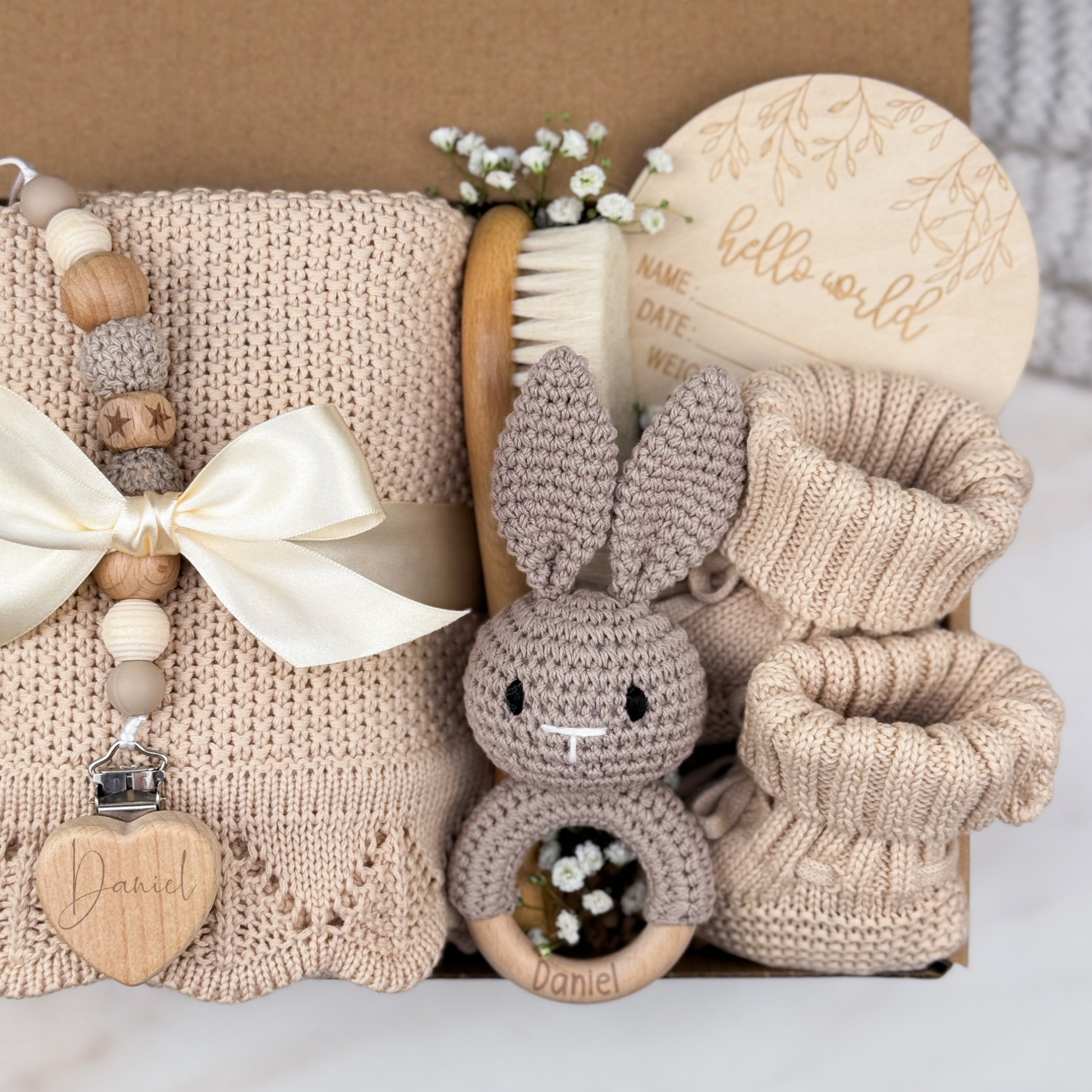 A cozy, neutral-toned baby gift box perfect for baby showers or welcoming a newborn. Features soft, personalized essentials and a charming bunny rattle—ideal for parents who love earthy, timeless keepsakes.