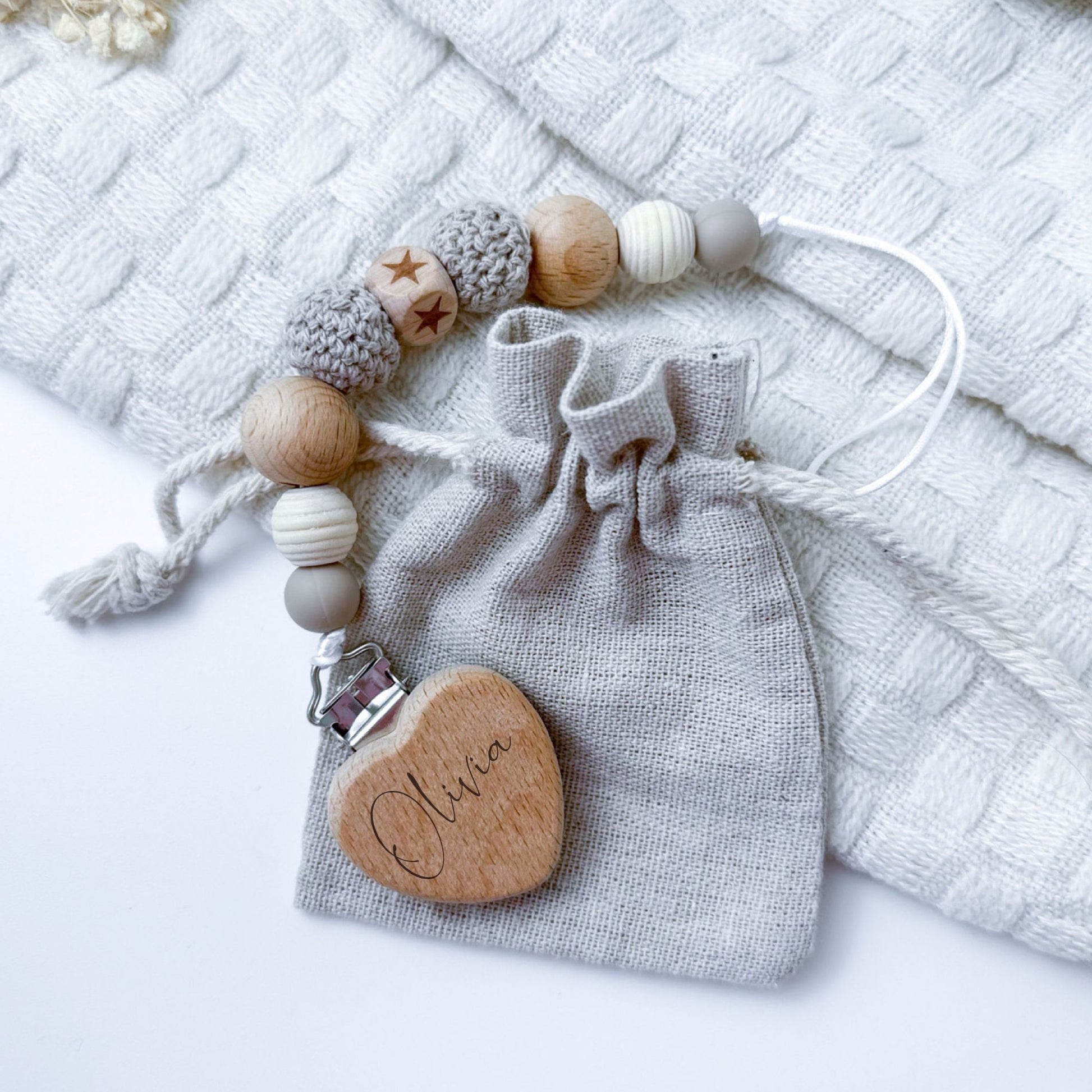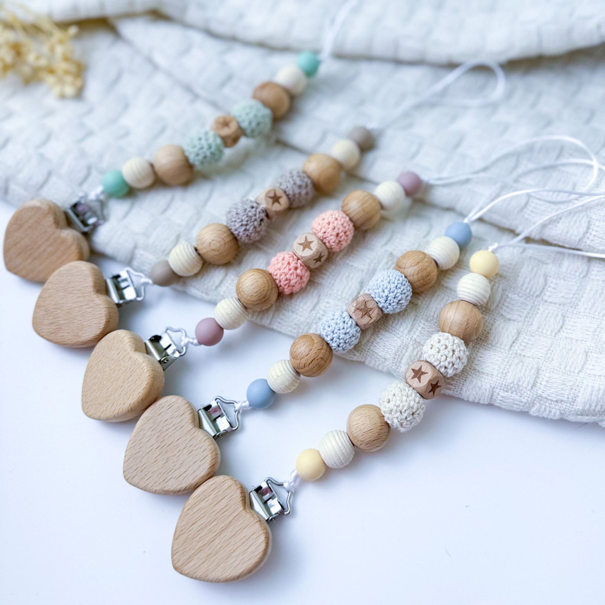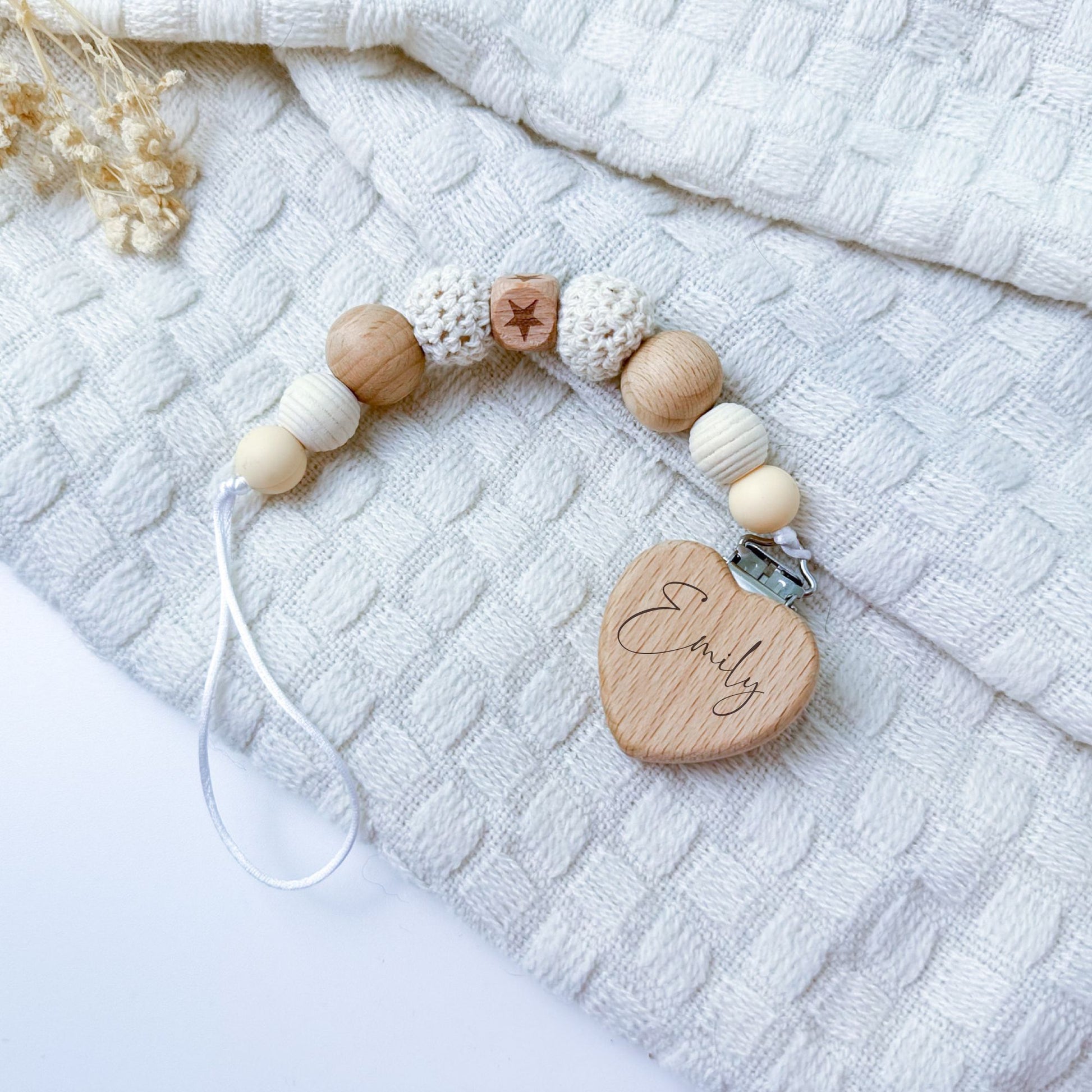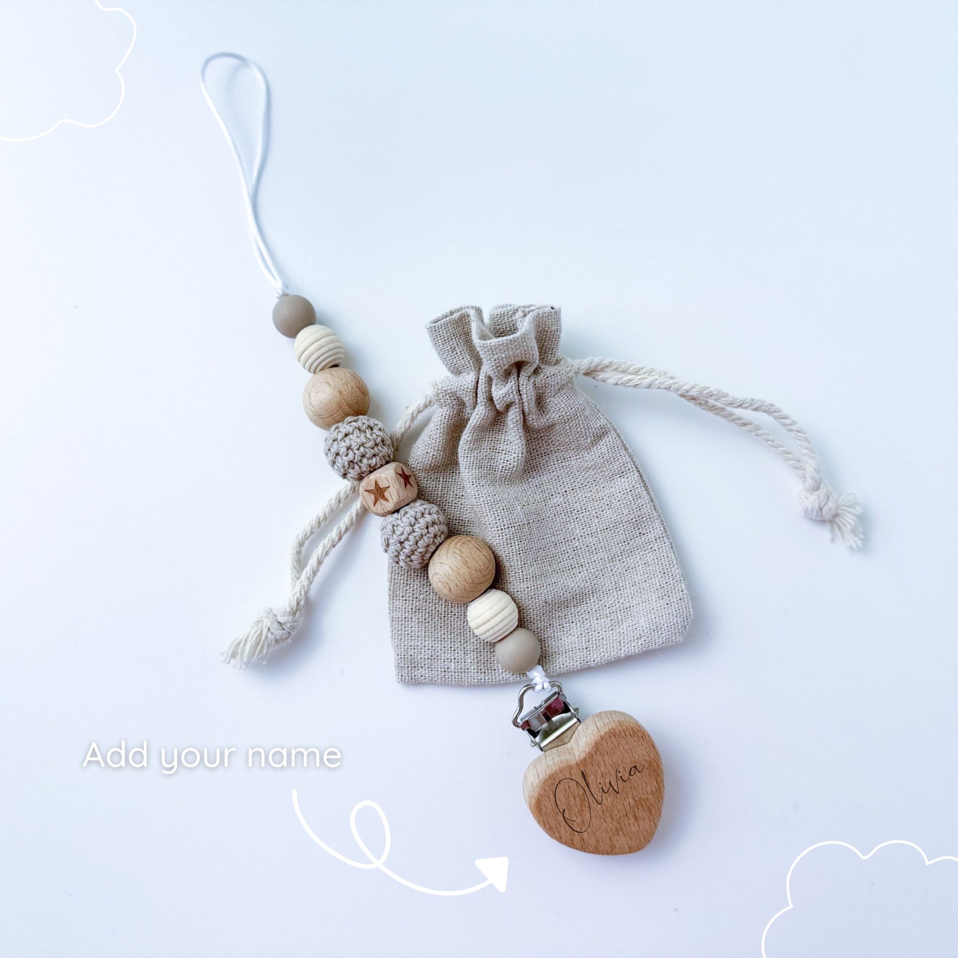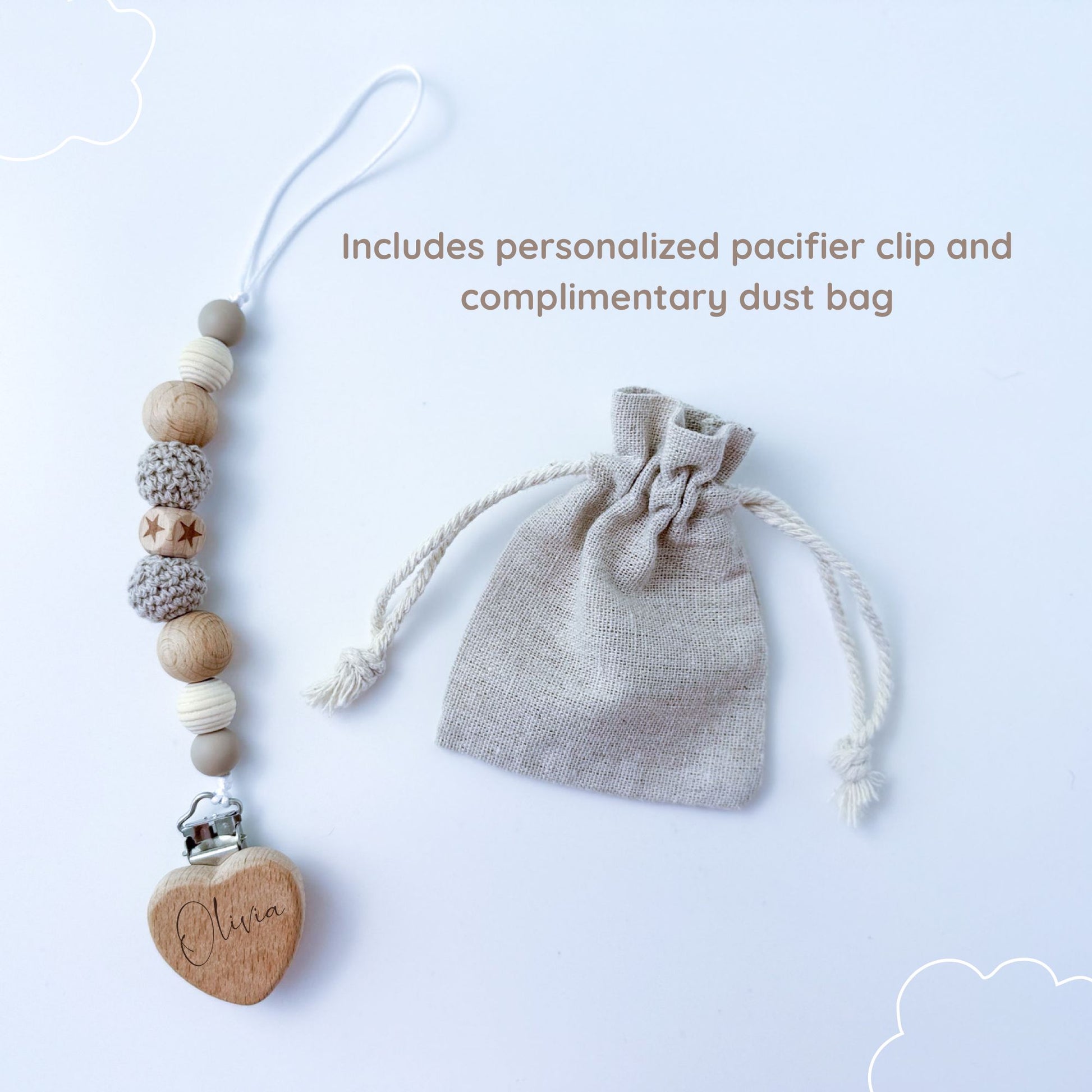 Our Personalized Pacifier Clip is a beautiful and practical gift for any newborn, perfect for baby showers or mom-to-be celebrations. Featuring a custom engraved holder and a charming boho crochet design, this stylish accessory keeps pacifiers close and secure. Thoughtfully crafted, it adds a personal touch to any baby gift collection.
