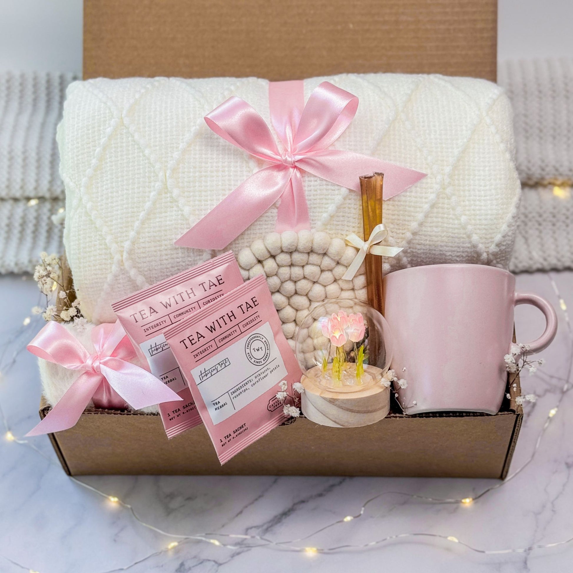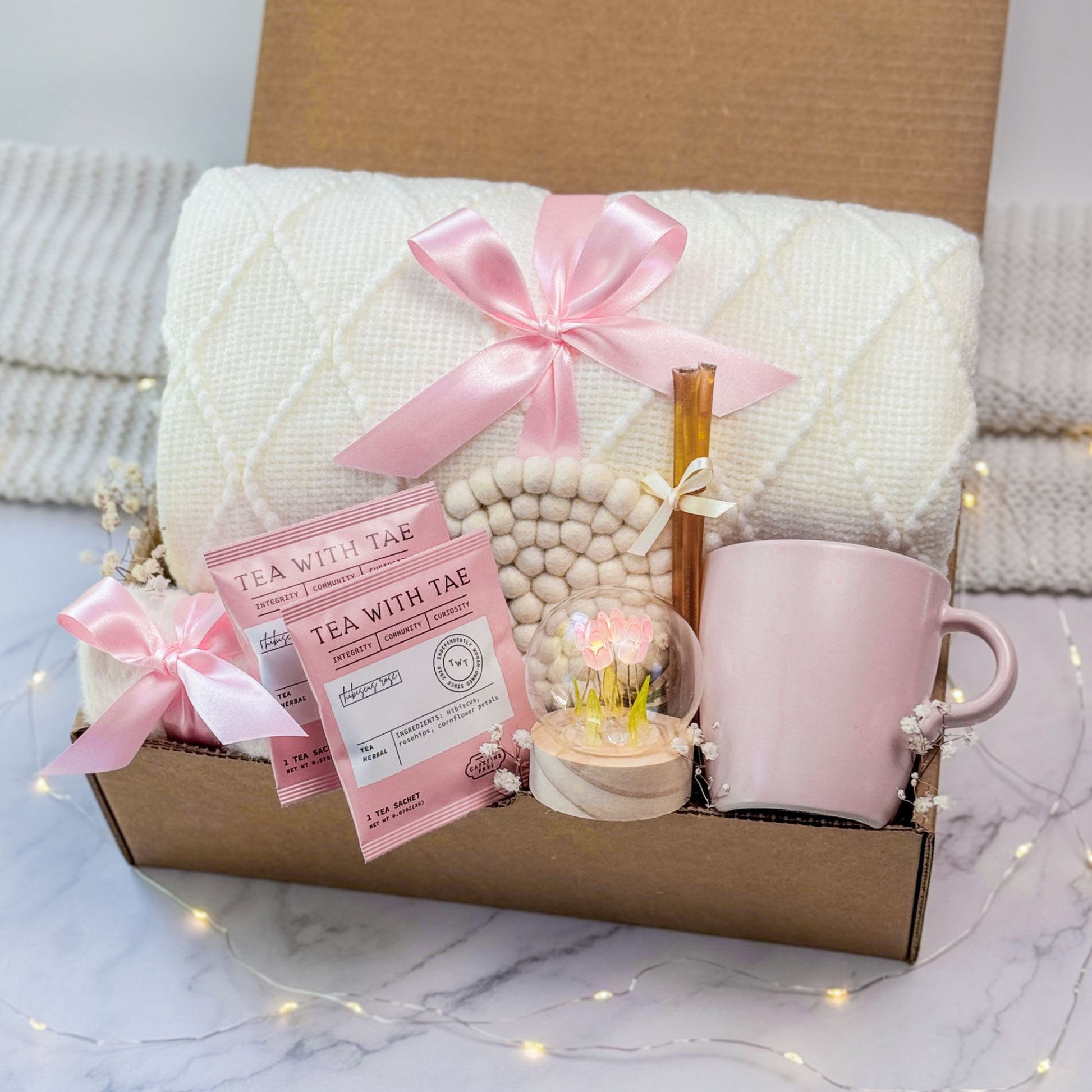 This cozy gift box is the ultimate comfort set, featuring a soft, luxurious blanket, soothing tea, and a decorative flower night light. A perfect way to offer relaxation and warmth, making it an ideal gift for any occasion. Give the gift of relaxation today.