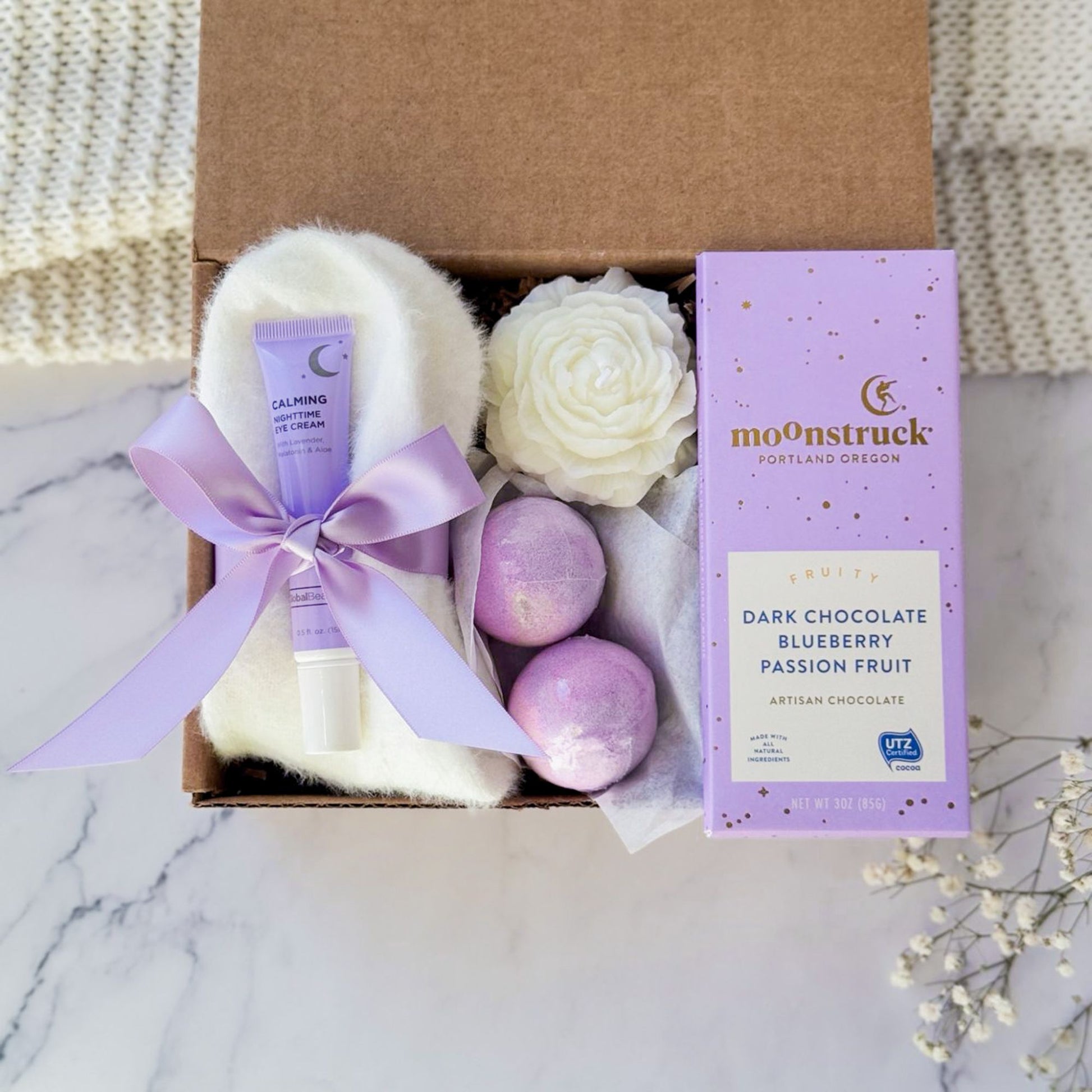 Unwind with this soothing lavender-themed gift box. Includes calming skincare, fluffy socks, bath bombs, chocolate, and a flower-shaped candle for a full spa-at-home experience. The perfect relaxing gift for her, ideal for any occasion.