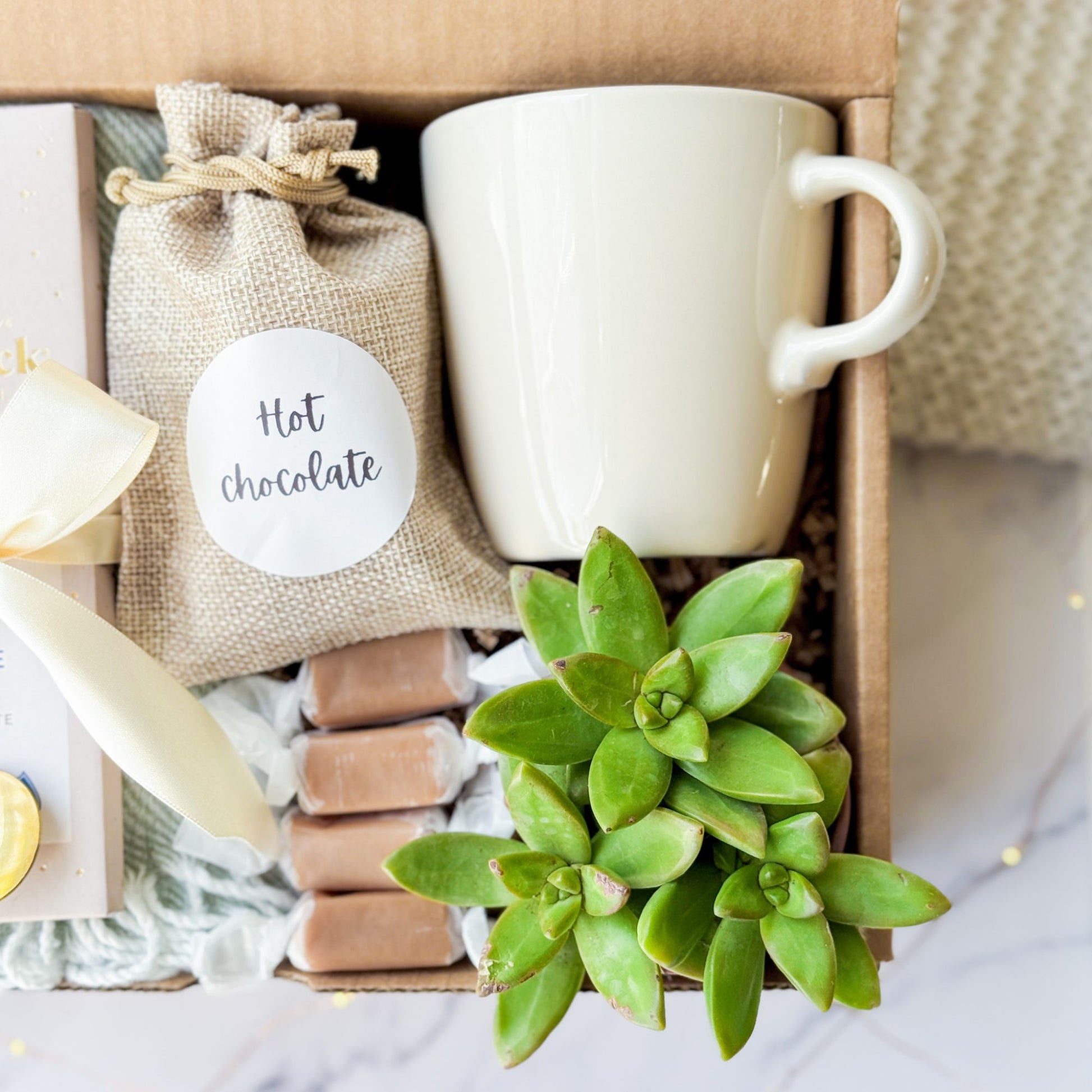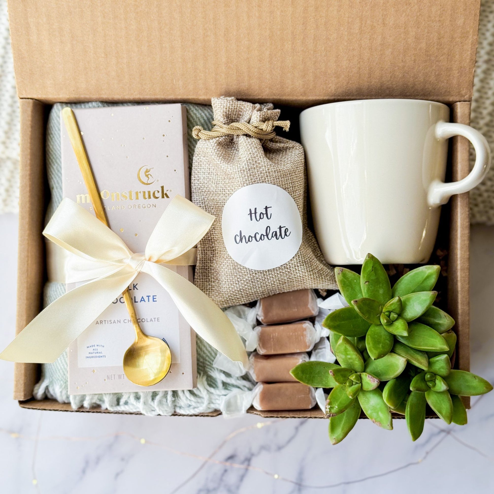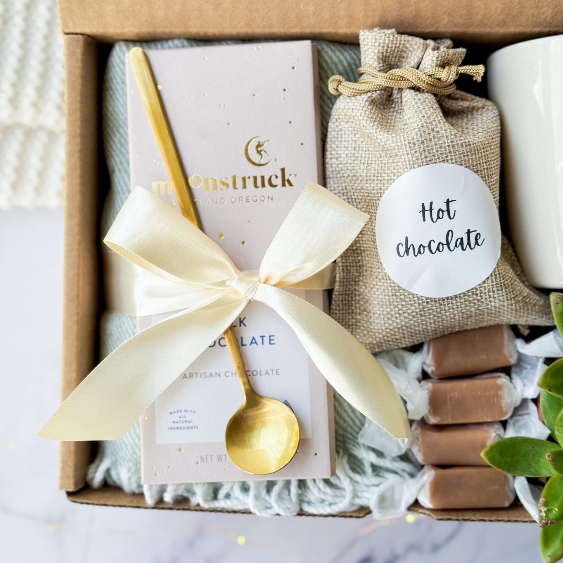 Delight in cozy indulgence with this charming gift box featuring a plush throw, decadent hot chocolate mix, artisan chocolate, a golden stirring spoon, a ceramic mug, soft caramels, and a vibrant succulent. This box is the perfect treat for cold days, offering a warm and luxurious experience. Ideal for gifting to loved ones or for personal pampering.