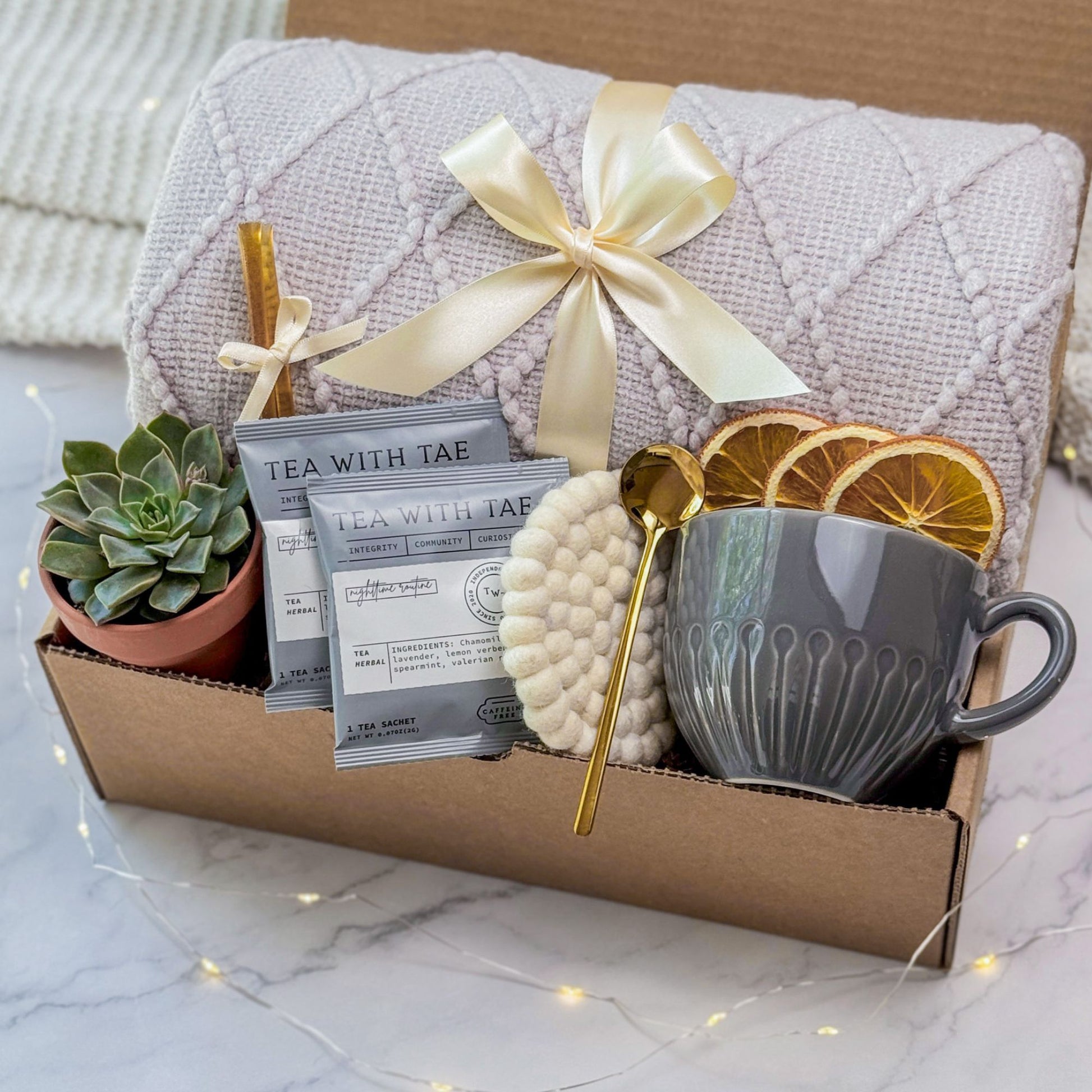 Send warmth and comfort with this cozy tea and blanket gift box. Complete with soothing tea, a cute succulent, and a soft, knitted blanket, this thoughtful set is perfect for anyone who needs a moment to relax and unwind. A perfect self-care gift for any occasion.