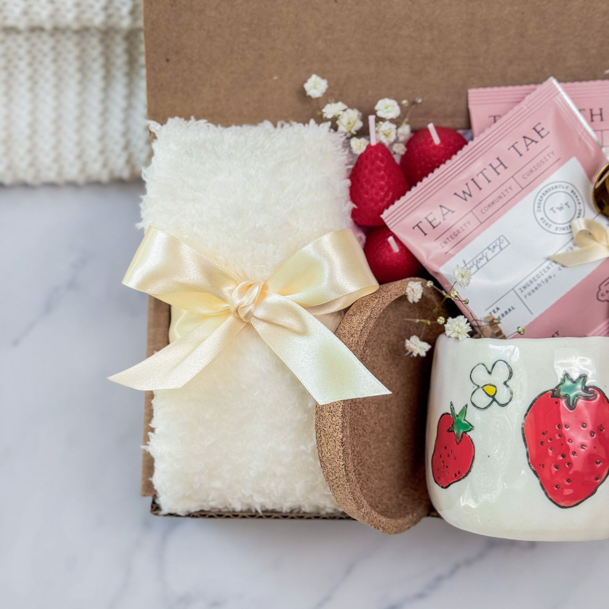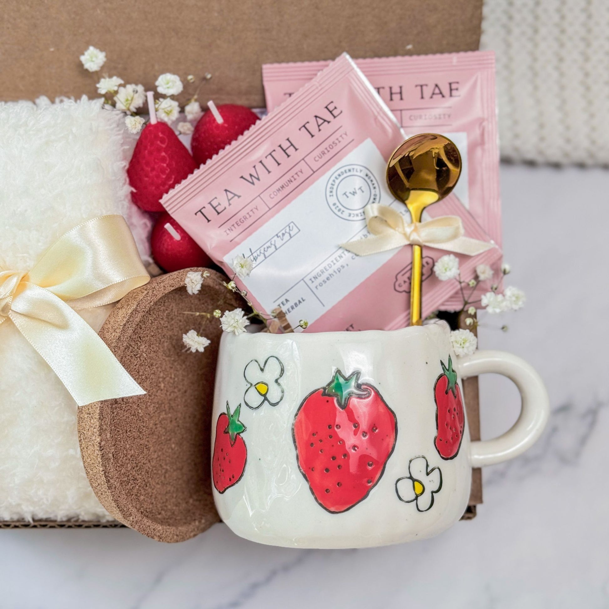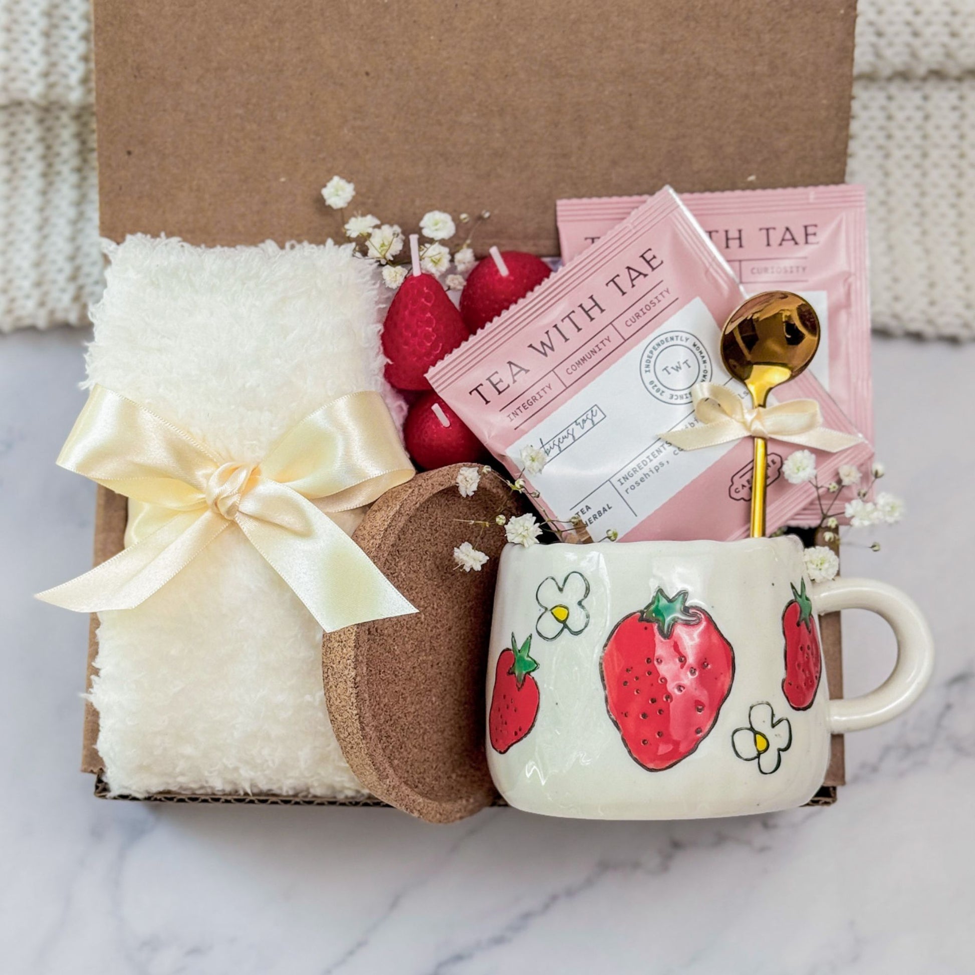 This cute and cozy gift box features a strawberry-themed mug, soothing tea, and soft accessories. Perfect for a little self-care moment, this thoughtful gift will brighten her day. Ideal for Mother’s Day, birthdays, or a simple cheer-up gift.