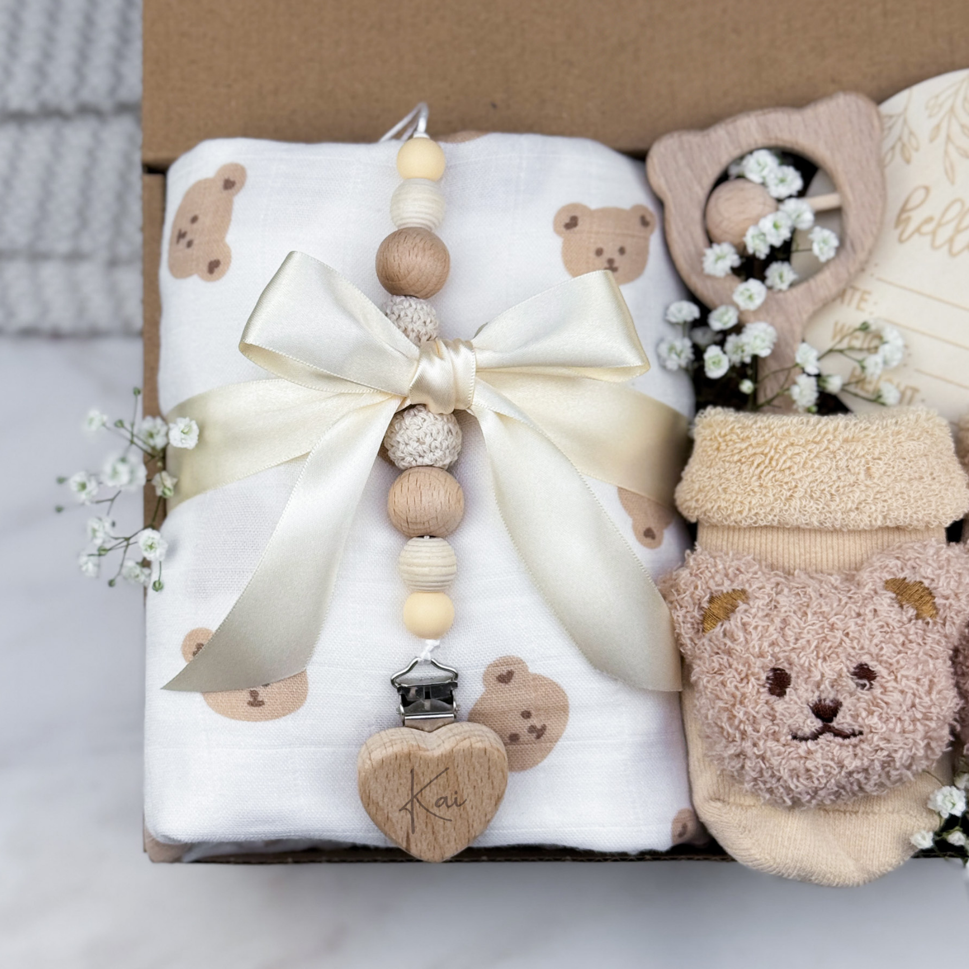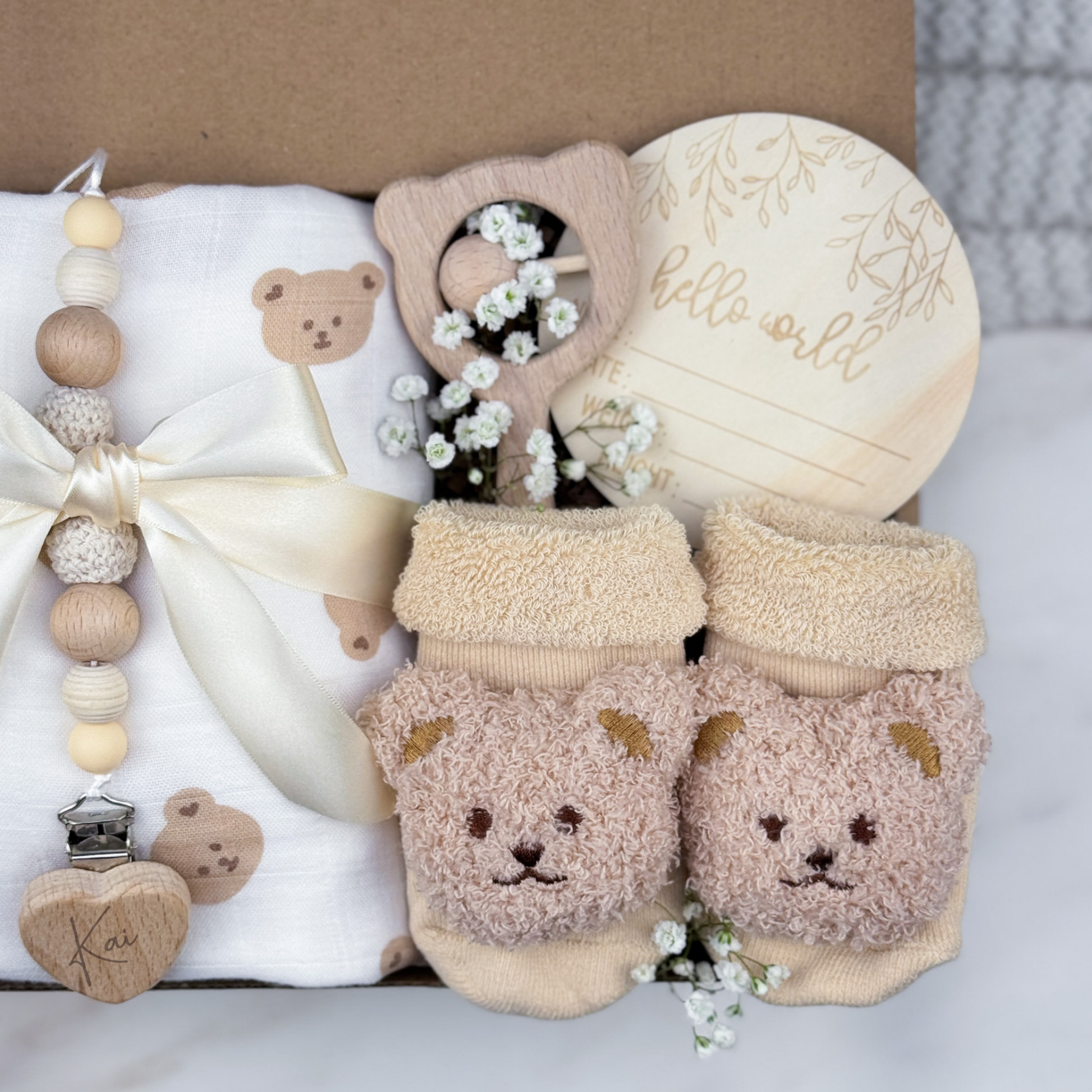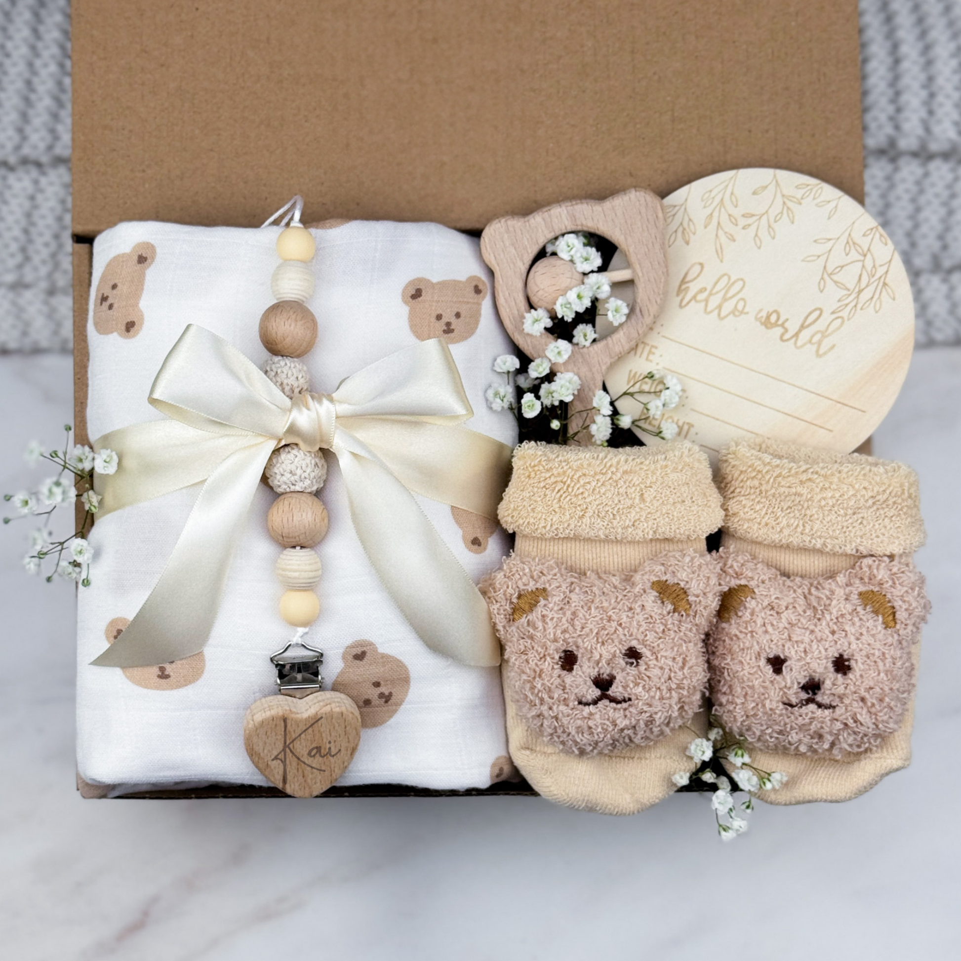 A gender-neutral baby gift box made for cozy first moments. Includes soft bear socks, personalized pacifier clip, and natural wood toys for a timeless keepsake. Perfect for baby showers, minimalist parents, and newborn gifting.