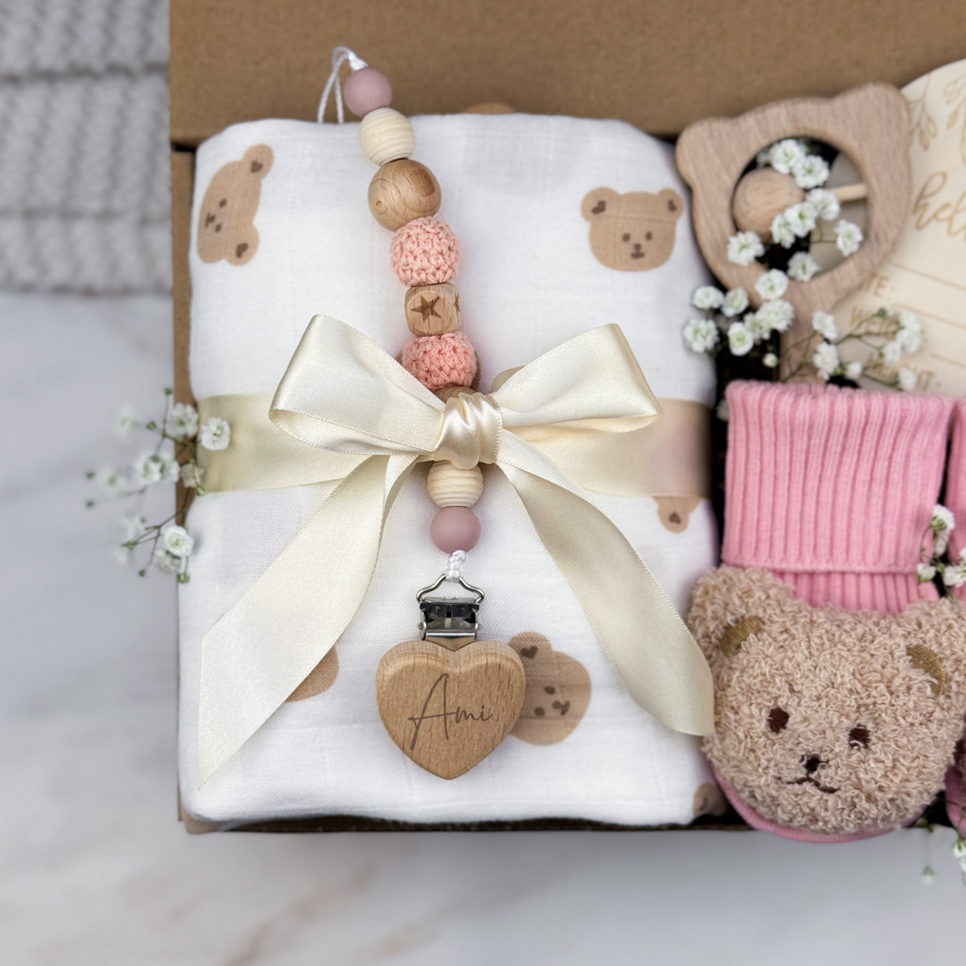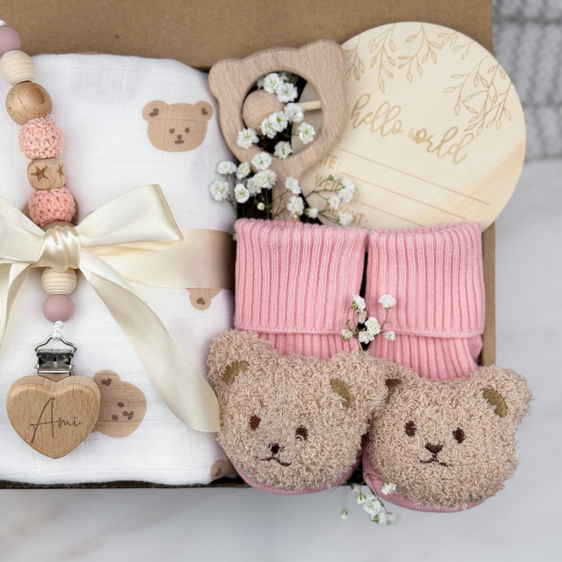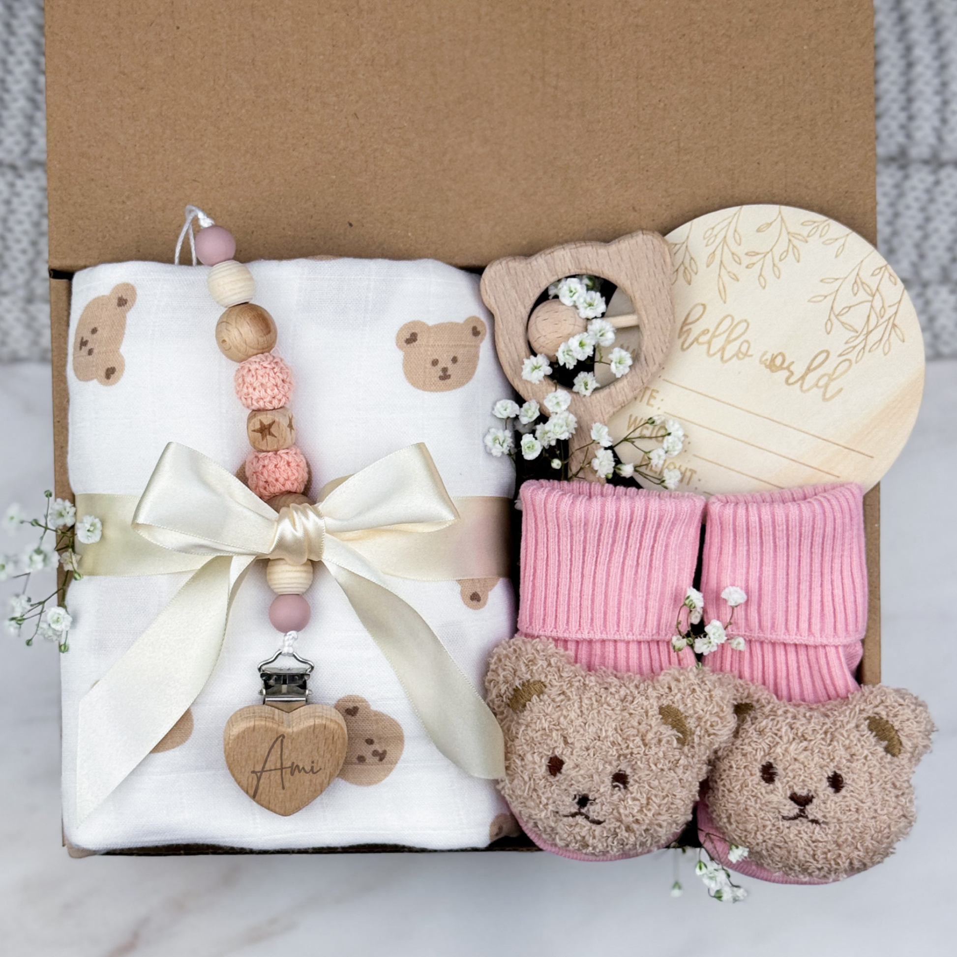 This baby girl gift box brings softness and charm in every detail. Featuring adorable pink bear socks and custom name clip, it’s the perfect baby shower gift or welcome present for a newborn girl. Sweet, soft, and ready to gift.