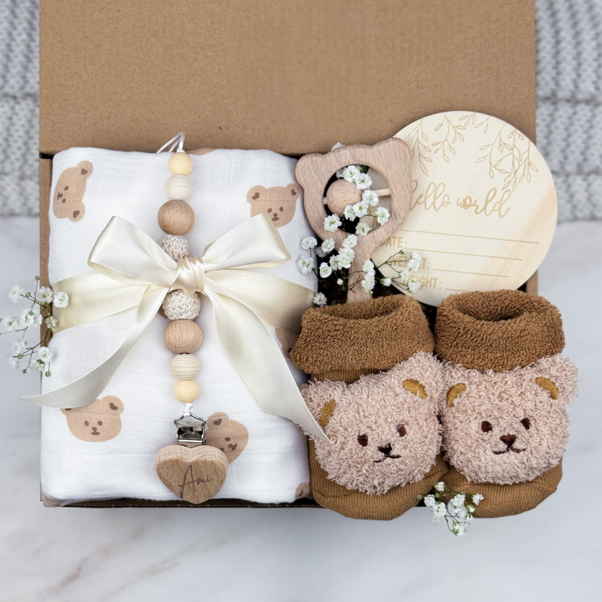 A cozy and thoughtful baby gift box featuring an adorable bear-print blanket, warm neutral tones, and wooden accents. Perfect for welcoming a newborn with a gender-neutral theme and classic teddy charm.