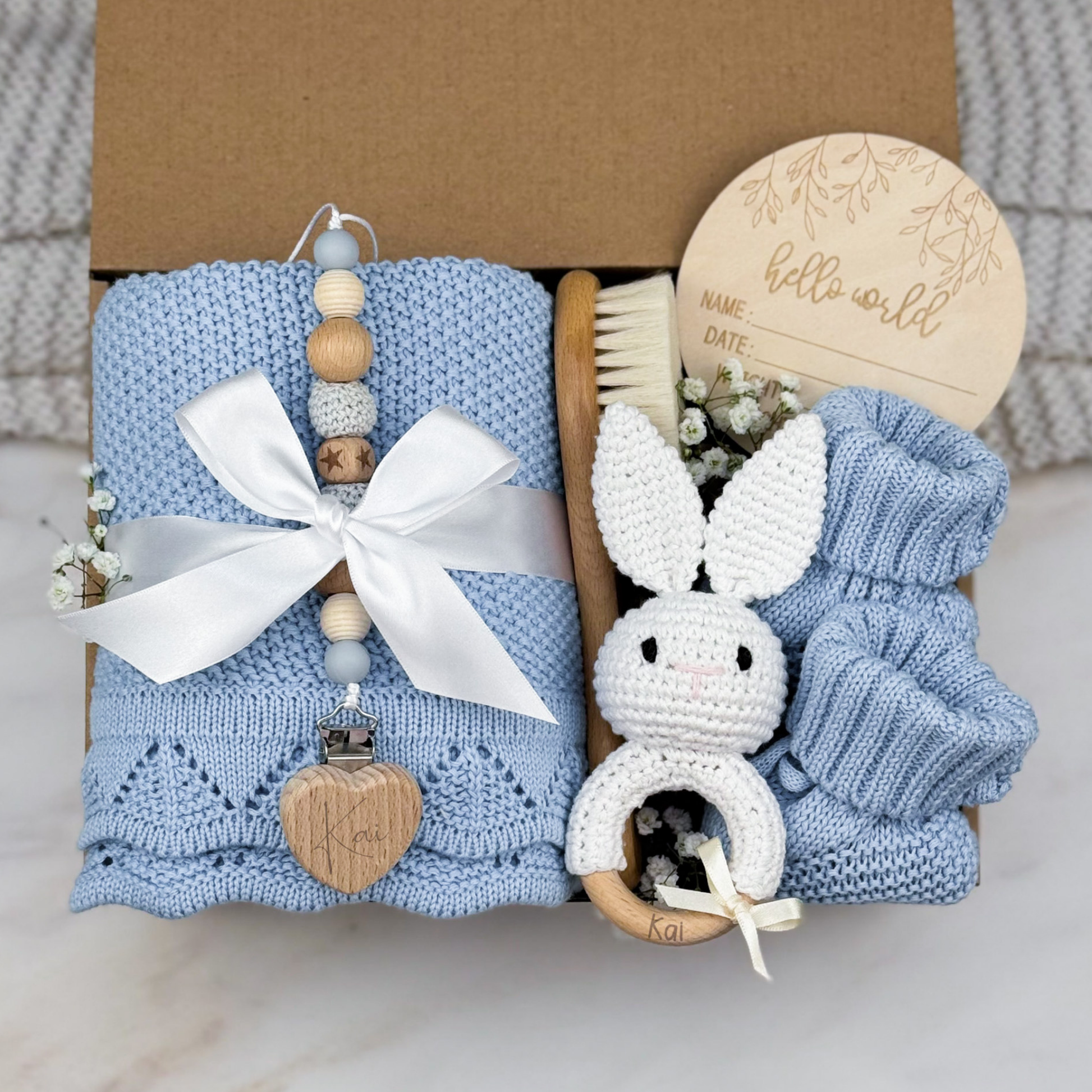 Welcome a little one with this charming Baby Boy Gift Box, featuring a cozy knitted blanket, soft booties, and an engraved wooden bunny rattle with a matching pacifier clip. Thoughtfully curated for baby showers, newborn gifts, or hospital visits, this set combines practicality with a timeless keepsake. A heartfelt way to celebrate new parents and their precious bundle of joy.