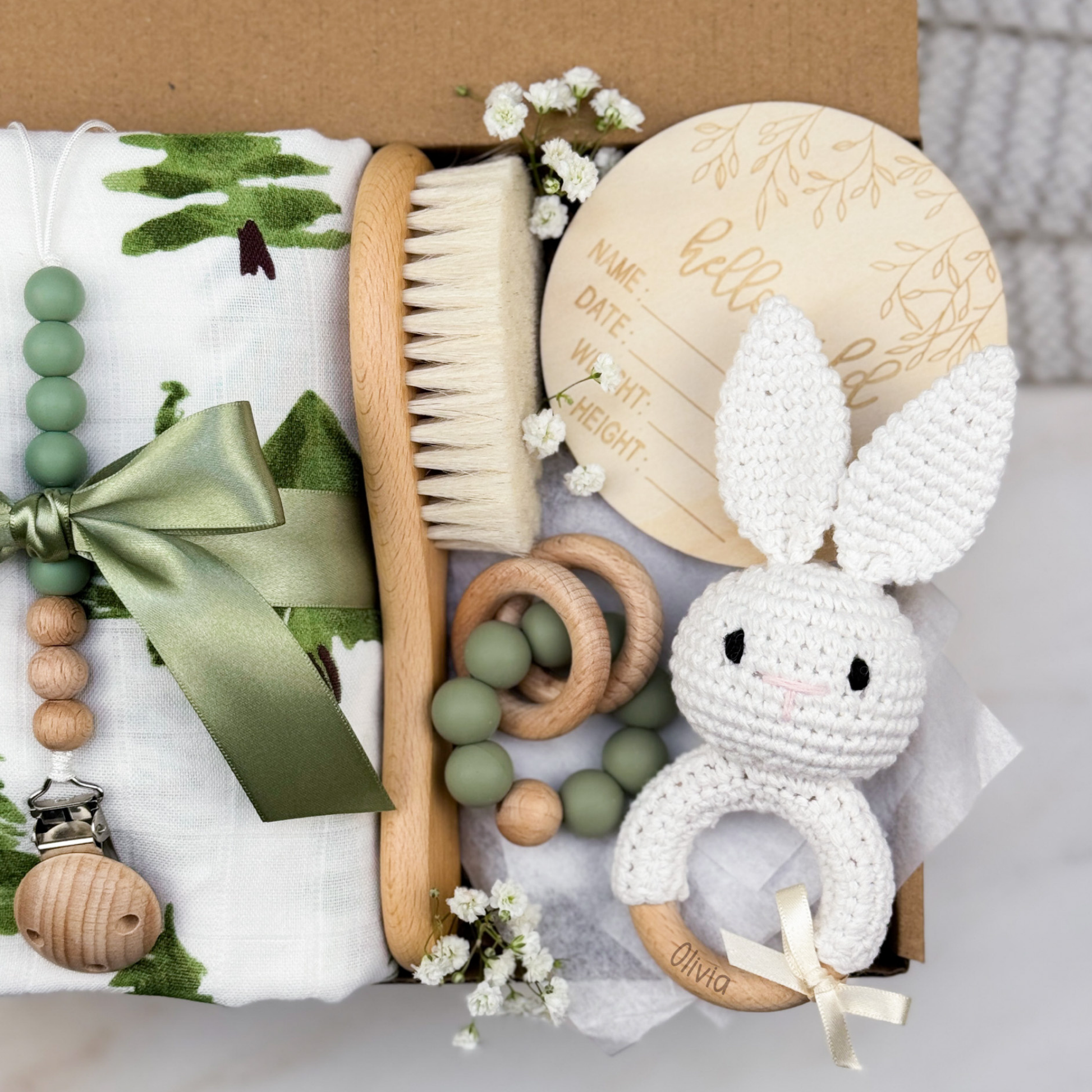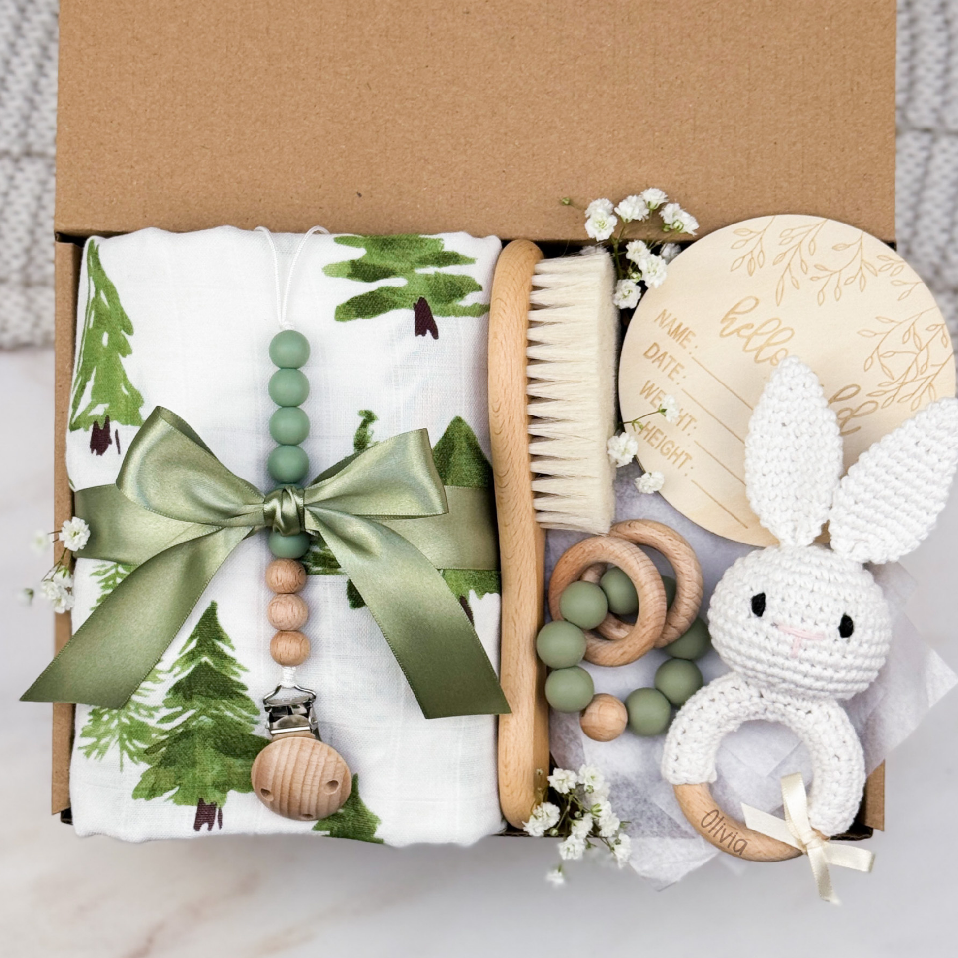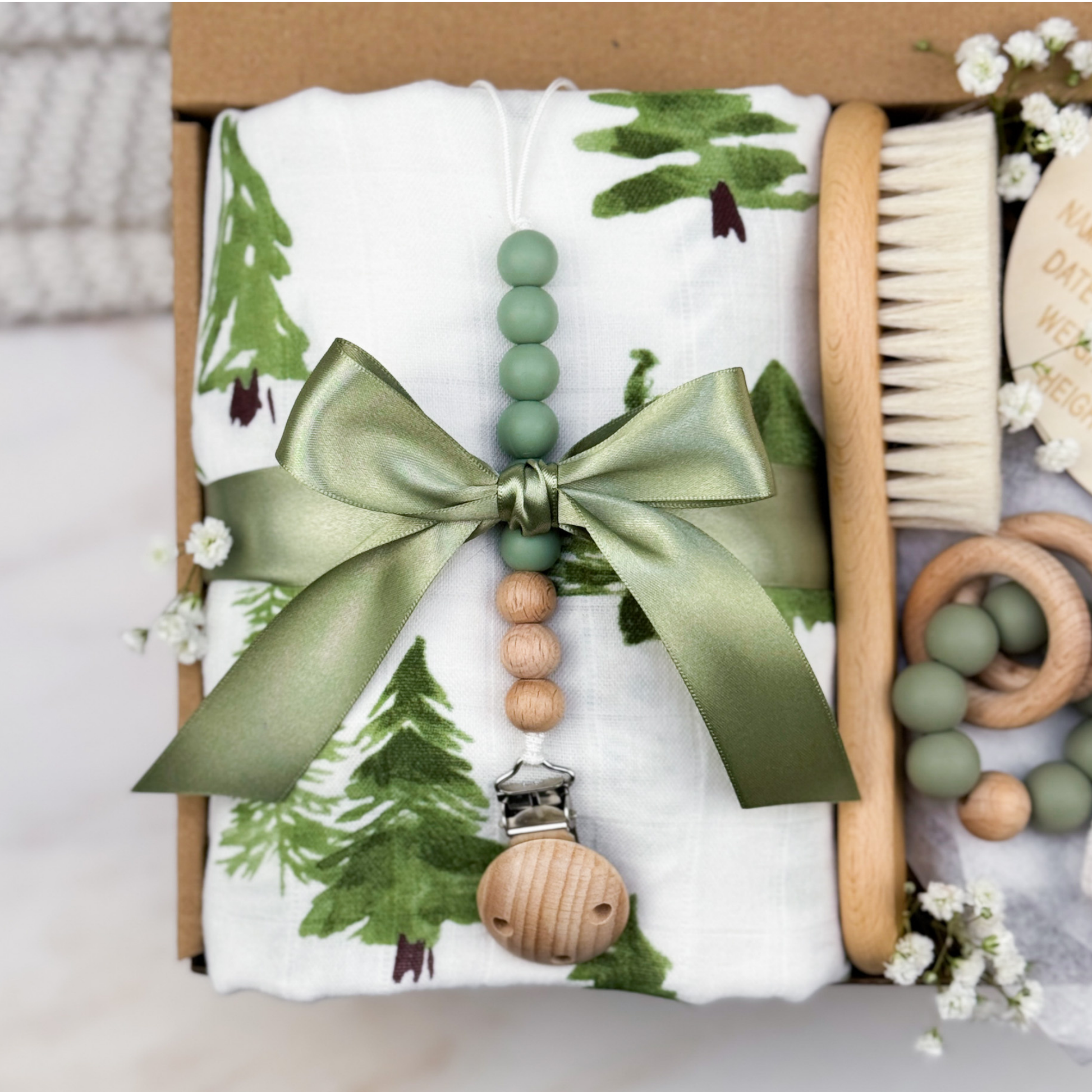 Inspired by nature, this box celebrates baby with earthy tones and forest flair. A gender-neutral gift full of cozy touches. Ideal for outdoor-loving families.